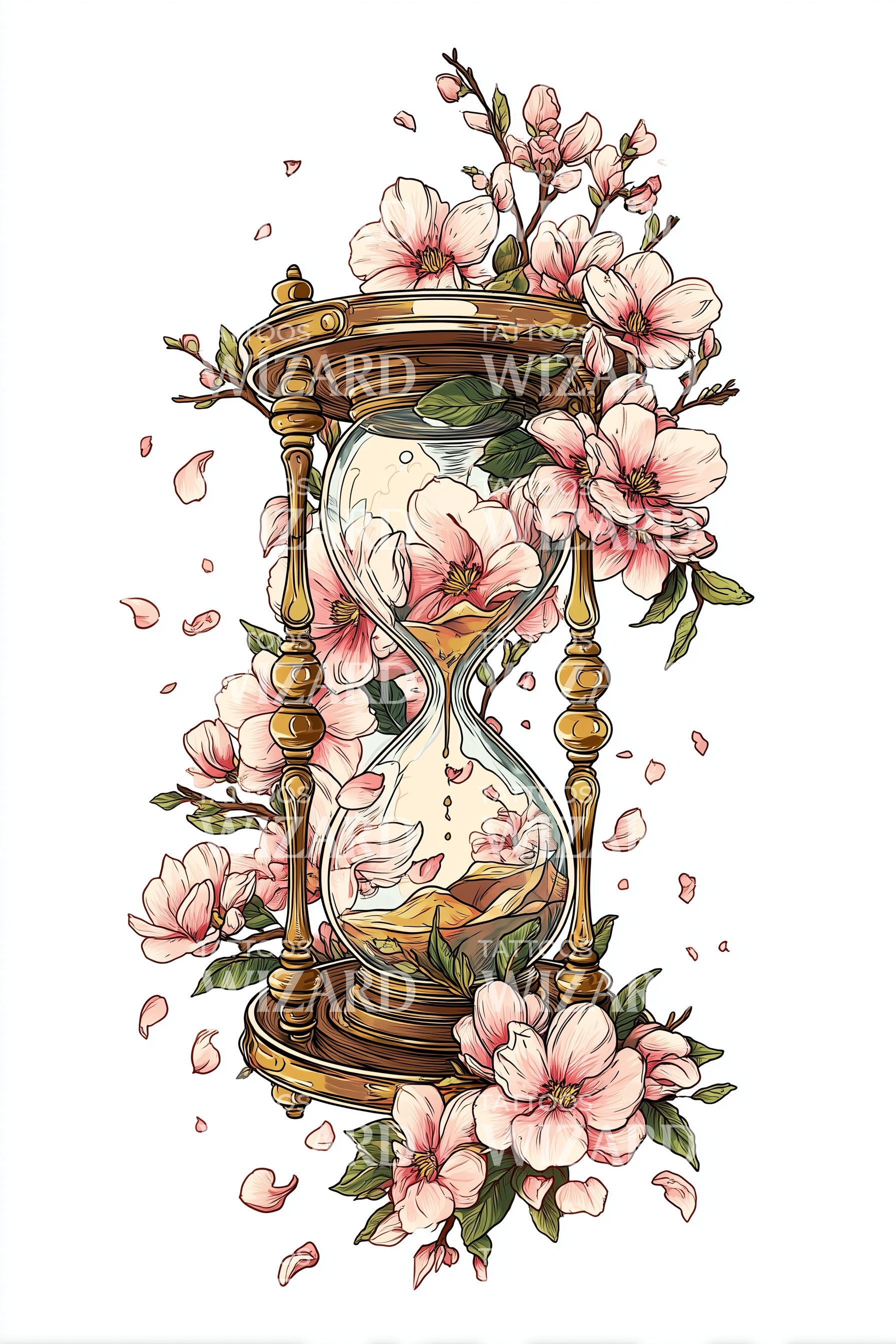 沉醉于这款插画风纹身设计的永恒魅力。它巧妙地融合了樱花与沙漏的复古主题。作为对流逝时光的生动诠释,木质纹理包裹其中,这件作品是真正对生命、美丽与一切存在短暂本质的赞颂。