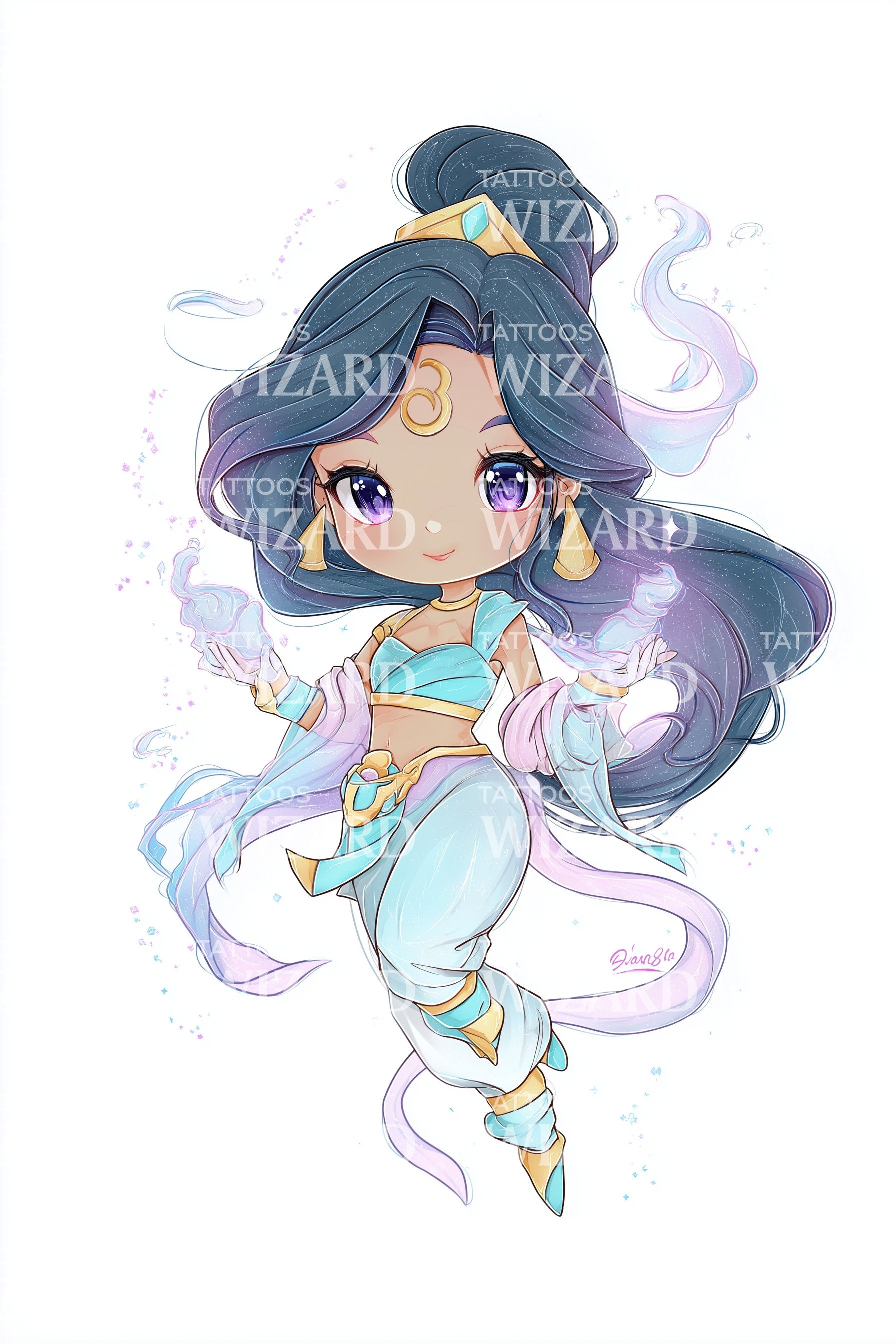 沉浸于这个迷人的动漫风格纹身设计所营造的奇幻世界。设计以一位高贵的Q版公主为主角,融合了魔法元素、卡通般的可爱与经典动漫美学。这是对异想天开魅力的美丽诠释,专为真正热爱日本动漫与奇幻的你精心打造。