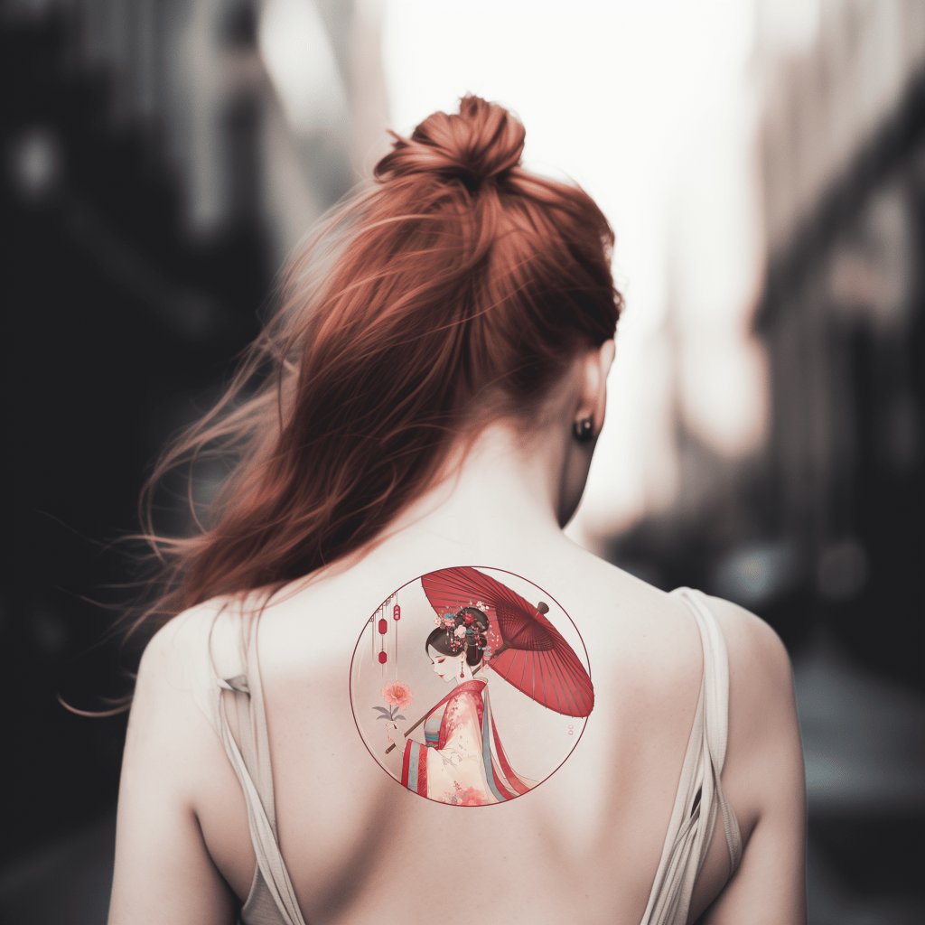 沉浸在这个传统中国风格纹身设计的美丽中。这个插图设计展现了一位神秘的女性,手持伞,置身于绚丽绽放的花朵之中。这是对东方优雅的绝对致敬,增添了民族魅力到你的纹身收藏中。