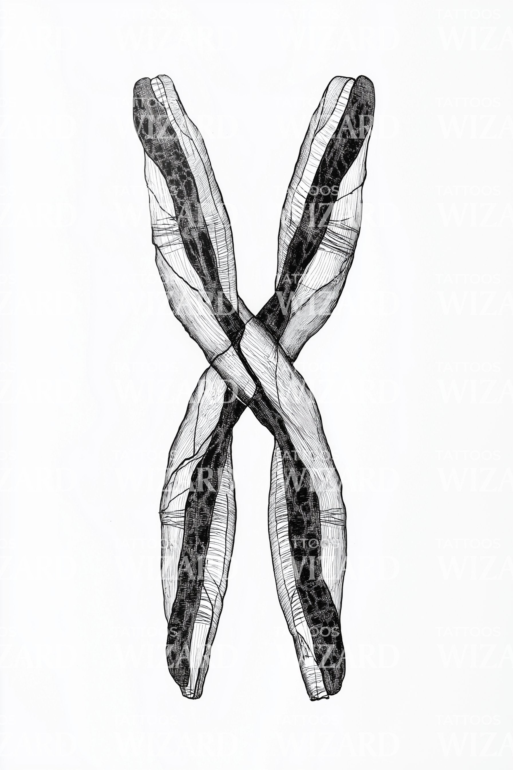 Chromosome as vow: genetics not as fate, but as inheritance you choose to interpret. A ribbon of science pulled tight into a cross, where grief and curiosity meet. For the one who studies their own origin and still rewrites it. In the sketch, your cells become scripture.