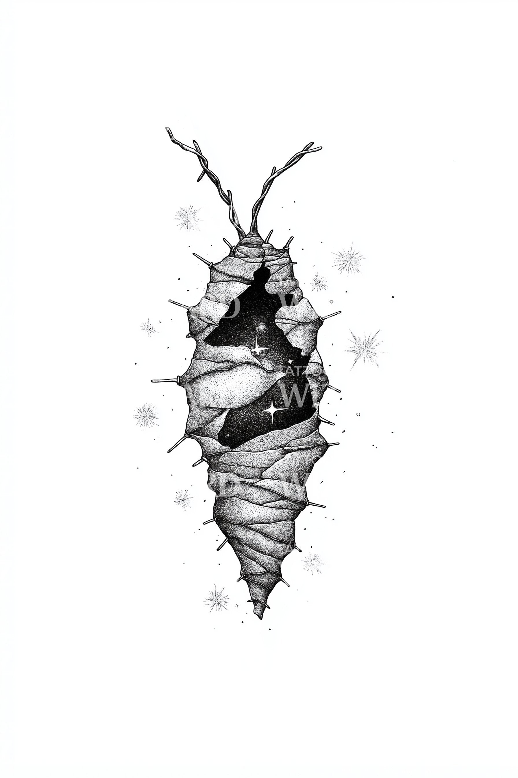 这款插画风格的纹身设计完美诠释了蜕变与重生,描绘了一个即将转变的蛹。裂开的石头细节引人入胜,隐约透露出即将破茧而出的昆虫,象征着个人成长与新生的力量。
