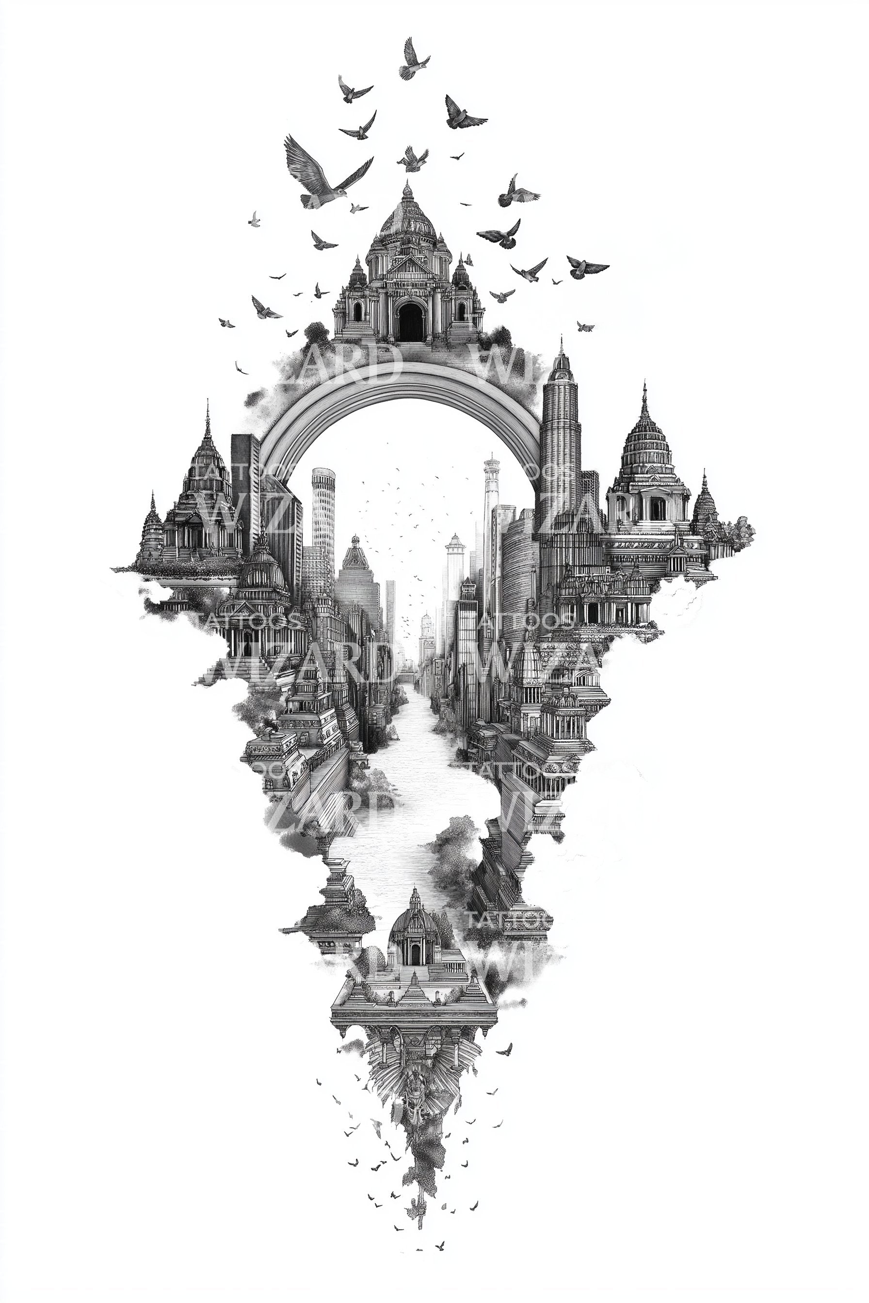 Cathedral-city in black&grey rises beneath a sweeping arch, castles entwined with towers and a bridge over a rivered street, birds threading the sky. A tale of thresholds, resilience, and wonder, it wears like a personal pilgrimage. Its vertical flow suits forearm, calf, or spine; sternum centers the journey.