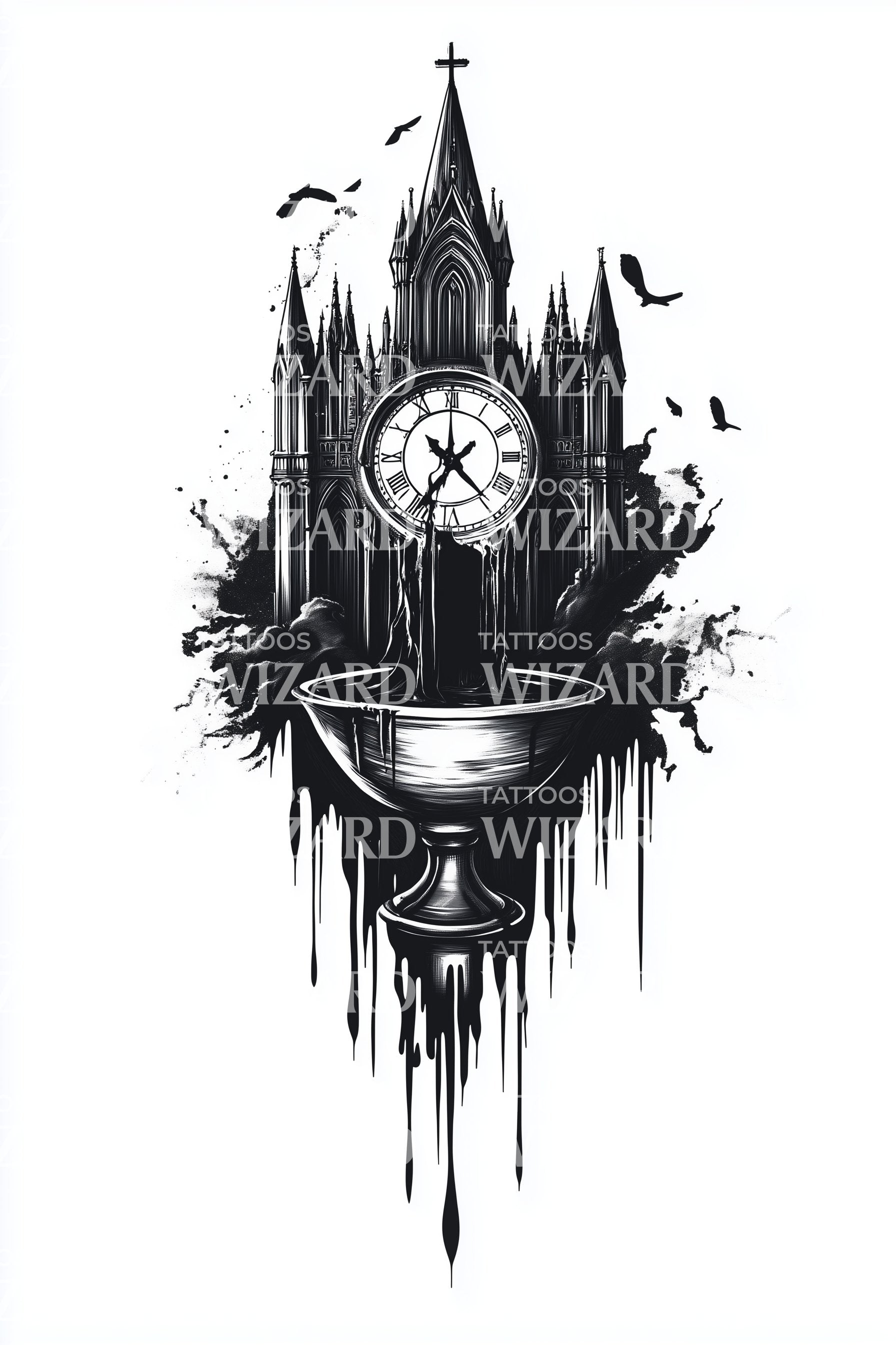 揭示你内心的神秘,这款哥特风格的纹身设计巧妙地将大教堂图像与象征信仰与时间的时钟交织在一起。其插画风格充满激情,捕捉了哥特式宏伟的永恒气息。是对崇高与神圣的惊艳表达。