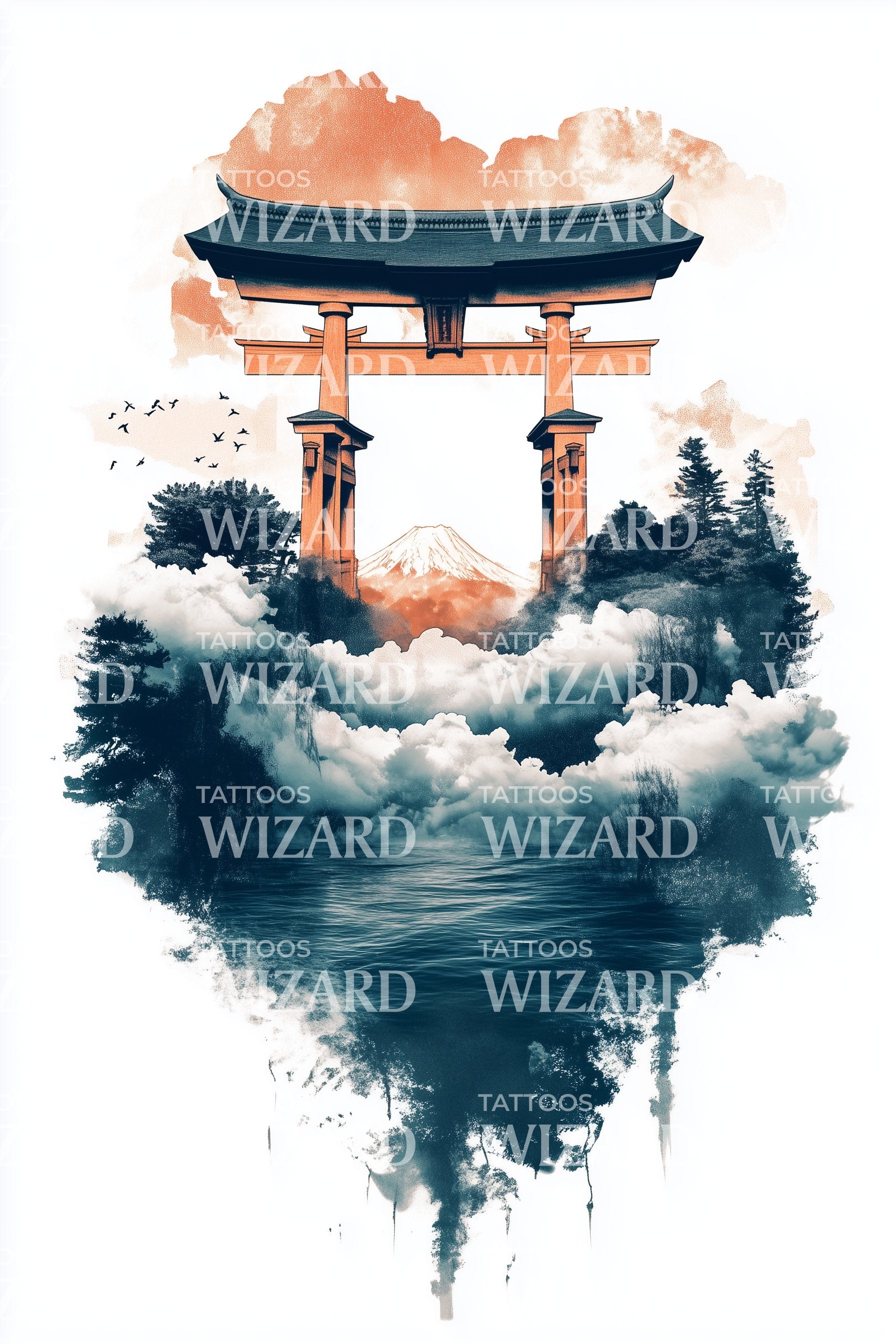 沉浸于这款令人惊叹的水彩纹身设计之美,融合了精神地平线的元素。艺术化描绘的云朵和水景完美地框住了一座宁静的鸟居门。令人着迷的柔和色彩融合,象征着平静的精神通道,是追求神圣宁静者的卓越选择。