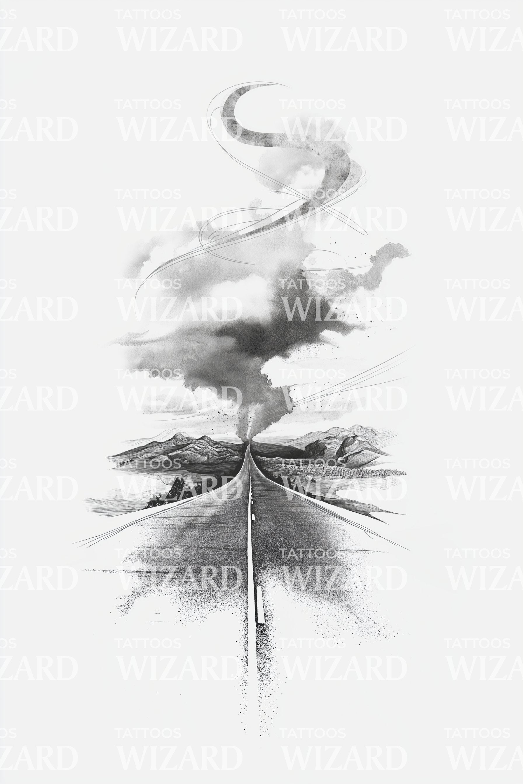 Blackwork landscape stretches like an endless road, dotwork asphalt guiding the eye toward a churning cloud, wind lines curling above mountains and a small roadside tree bending. Storm meets horizon, symbolizing movement through turmoil toward clarity. Worn as a compass, it feels steady, resilient, quietly electric.