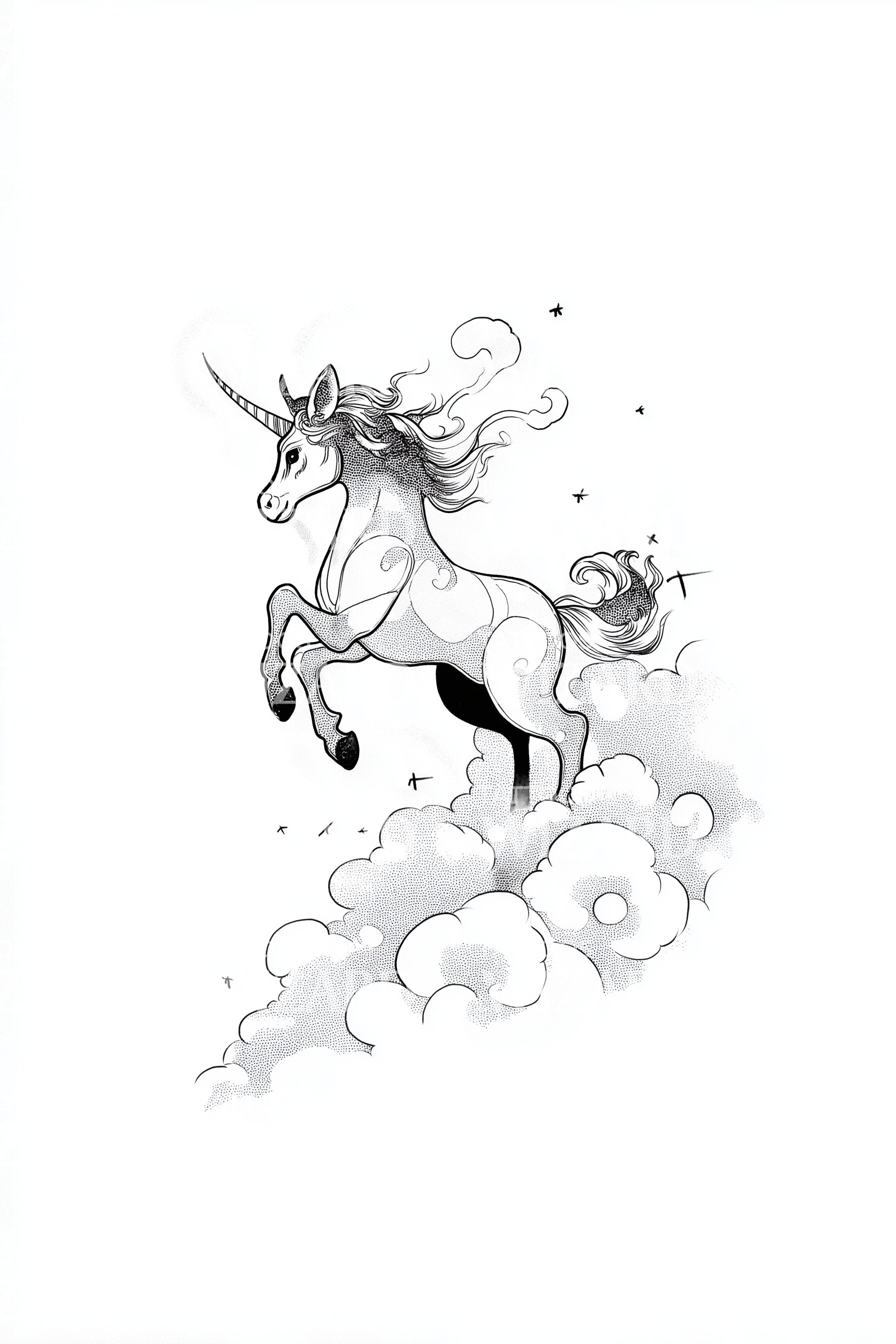 星光点缀的线条和点描勾勒出一只腾跃的独角兽,从蓬松的云朵中跃出,卷曲的云朵和细小的星星闪烁着奇思妙想与魔法。作为奇迹与坚韧想象力的象征,它将精神提升至天空,甜美而勇敢。非常适合纹在前臂、小腿、肩胛骨或肋骨处,垂直的流线和轻盈的曲线在这些部位熠熠生辉。