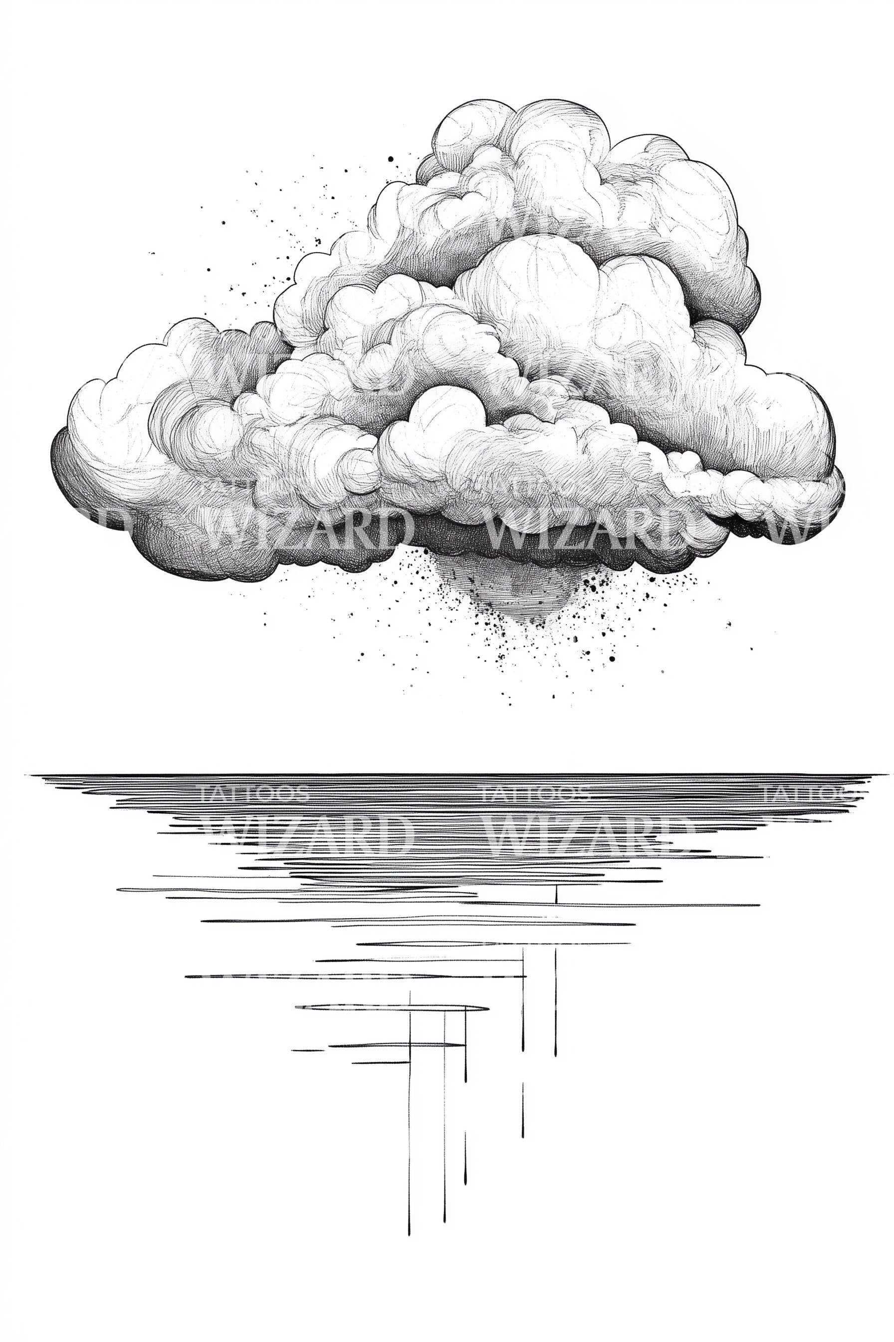 Ink-sketched cumulus floats above a linear horizon of fine lines, soft stipples suggesting rain over glassy water. Cloud embodies change and renewal; the sea holds memory and patience; the horizon invites becoming. Worn close, this minimal piece settles the breath, offering calm focus, gentle release, and spacious possibility.