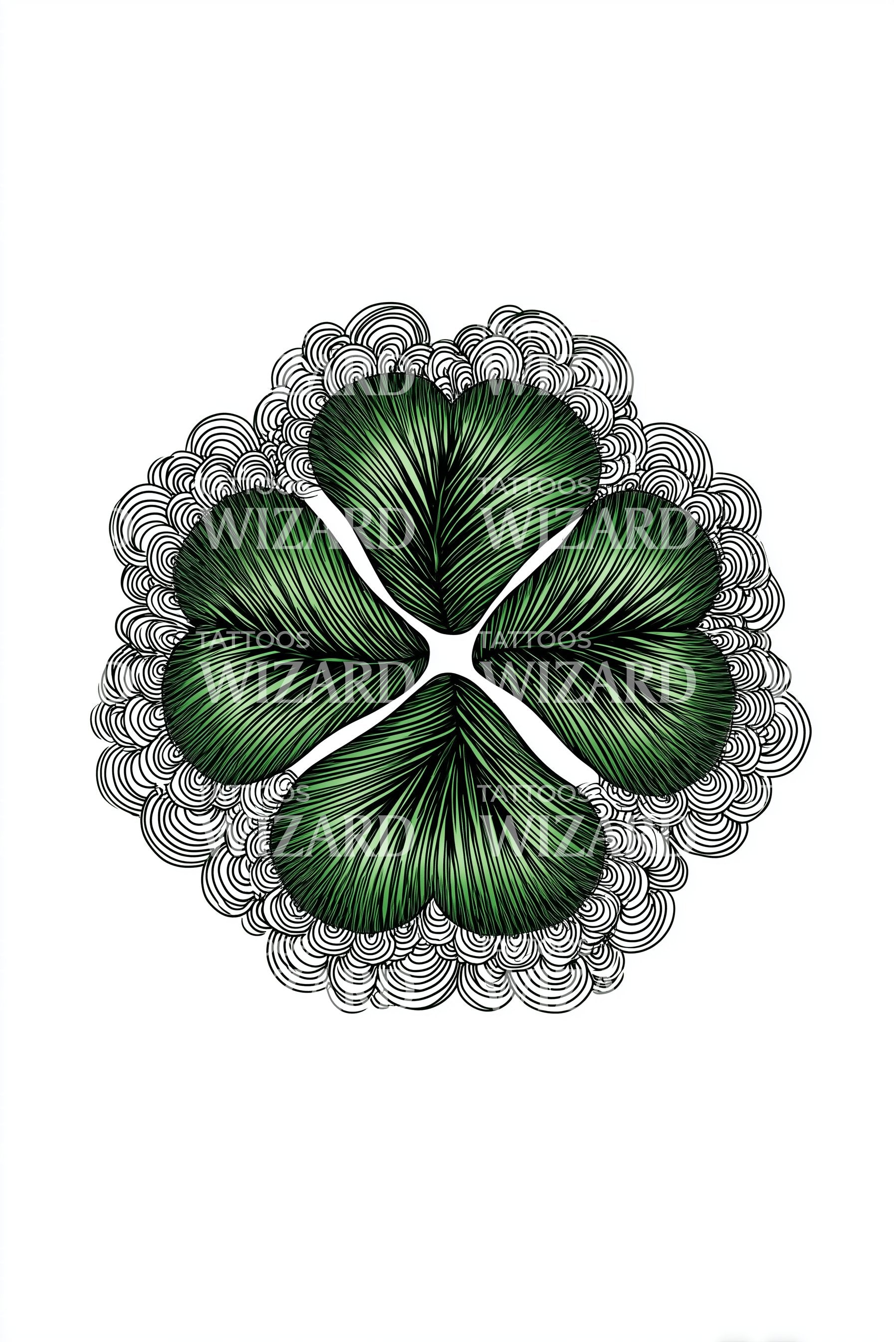 一款华丽的植物纹身,将精致的蕾丝编织于郁郁葱葱的绿色三叶草周围。这个复杂的设计平衡了优雅与象征意义,庆祝幸运、成长与自然之美。流动的细工花纹以精致的细节环绕叶片,完美适合手腕、脚踝或锁骨——一件永恒、女性化且富有深意的装饰魅力。