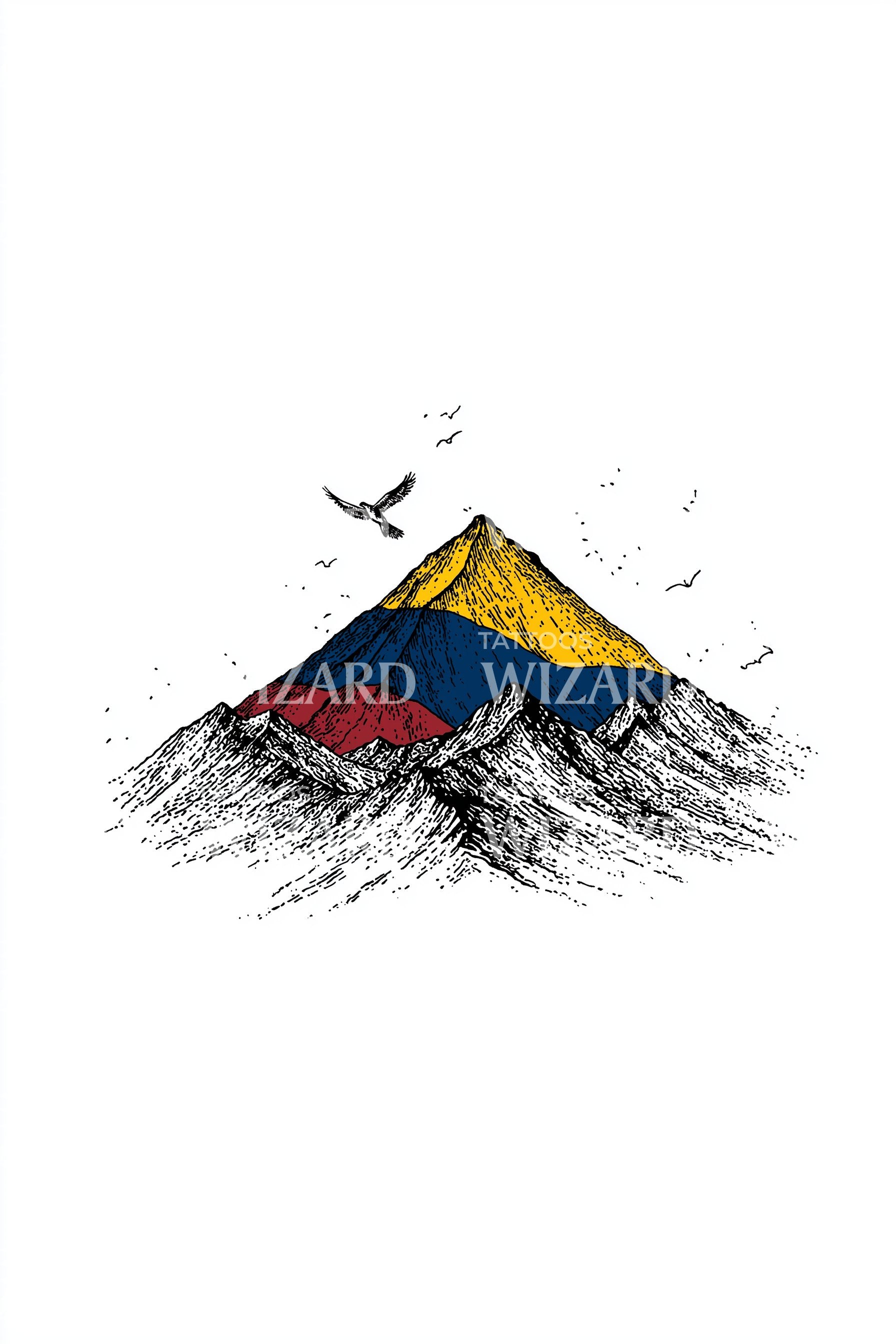水彩墨迹勾勒出飞翔的安第斯山峰,层叠在薄雾与阳光中。哥伦比亚的国旗在天际展开——鲜艳的黄色、大胆的蓝色、深沉的红色——柔和地渗入高山绿意。这一设计象征着旅行者的徽章,庆祝旅行、自然与高地精神,融合自由、根源与山间宁静,专为前往哥伦比亚的冒险者打造。