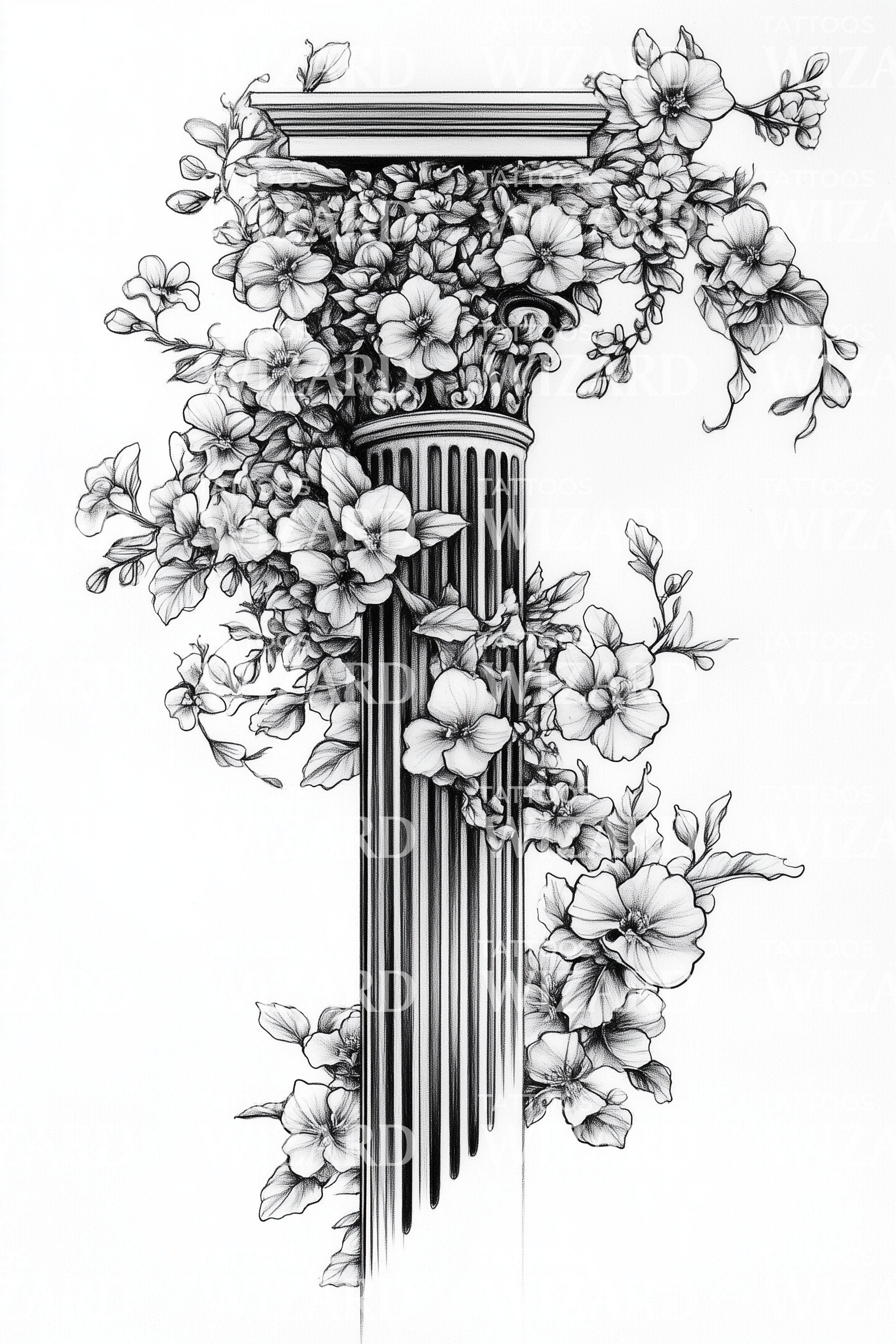 沉浸于古代魅力之中,这款装饰性纹身设计展现出强健的科林斯柱,交织着奇幻的花卉点缀,散发出力量与浪漫的和谐融合。精致的灰色调传达出永恒之美,是历史爱好者的理想装饰。