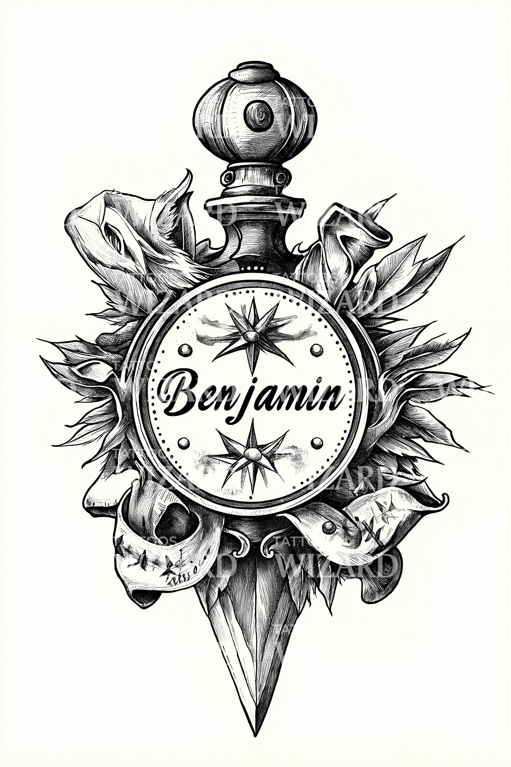 Neotraditional finery frames an ornate compass, crowned by a vintage pommel and anchored by a dagger’s gleam. Bold script spells Benjamin within star points, ringed by leaves and ribbon. Direction and resolve meet protection and honor, giving the wearer steady courage, purposeful navigation, and fiercely personal gravitas within.