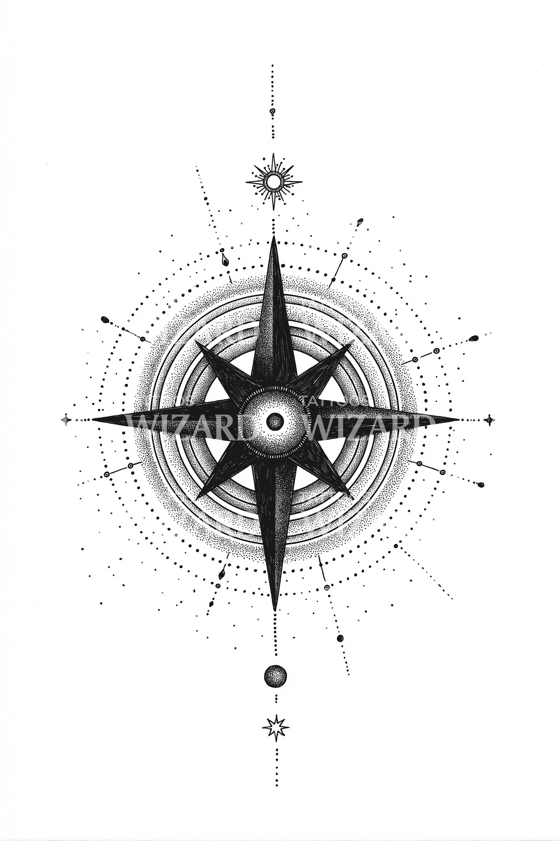 体验这款细线纹身设计的宇宙魅力,精致地融合了指南针和玫瑰元素。这是对导航与方向的星辰颂歌,配以闪烁的星星引导你的旅程。非常适合那些在神秘中寻求美丽并热爱天体主题纹身的人。