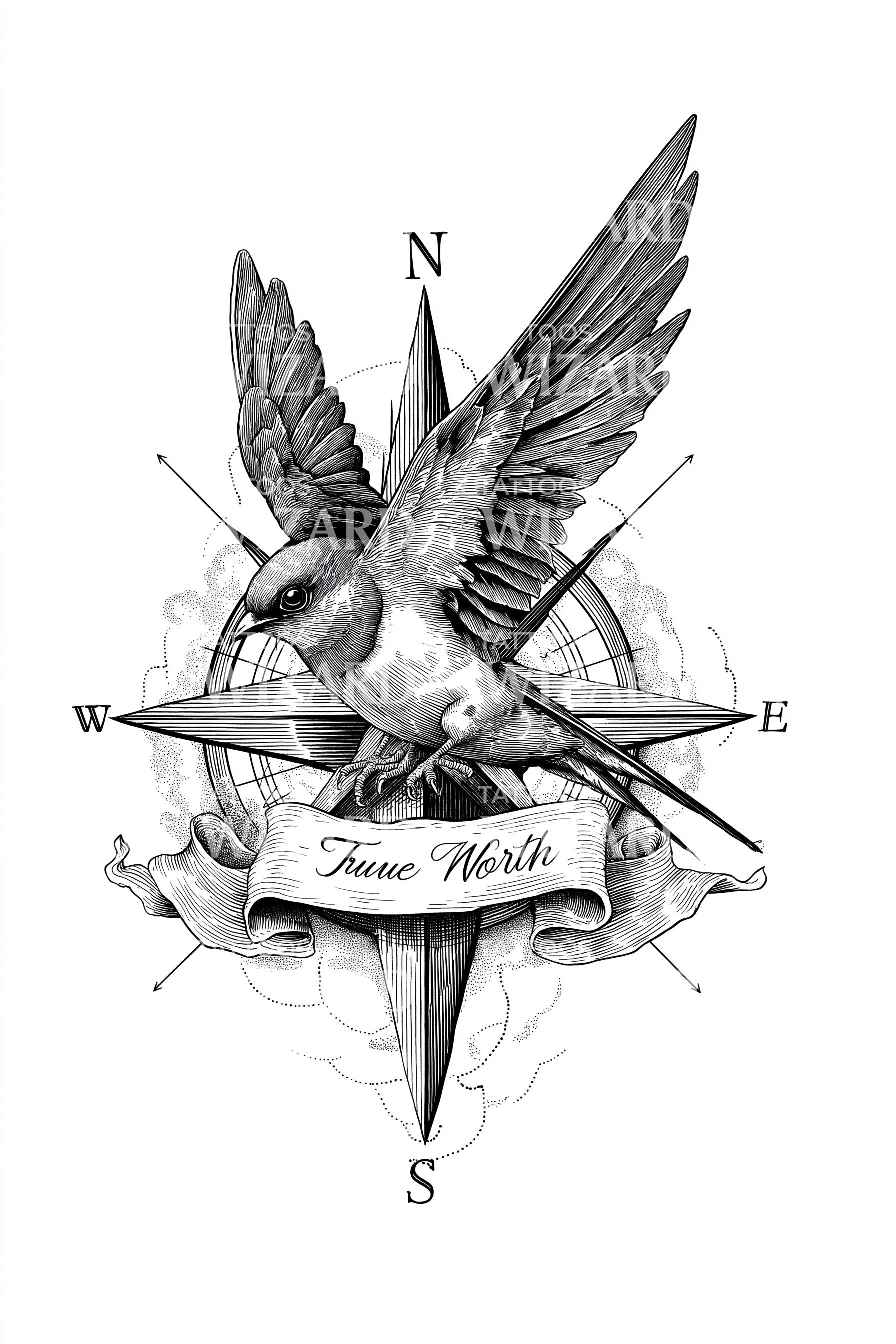 这款素描纹身设计精美地描绘了指南针和麻雀,象征着方向、旅行和导航。细腻融合的色调与细致的线条捕捉了希望的本质,为拥有旅行热情或寻求指引的人们提供了一种艺术的映照。