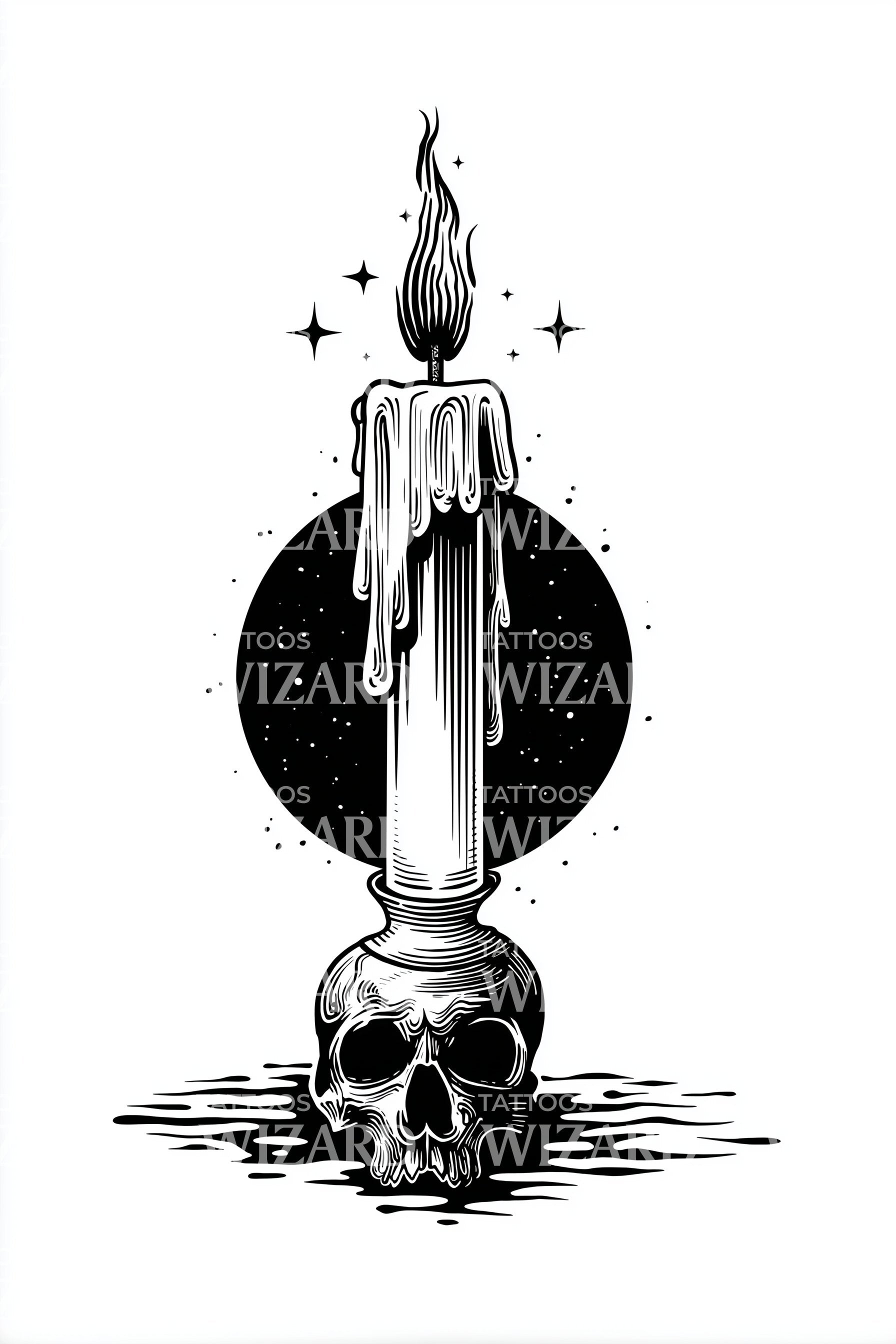 点燃你的精神之旅,这款宇宙纹身以骷髅为主题,幽灵蜡烛轻柔照亮。月亮与黑夜的回响为设计增添神秘氛围。非常适合那些寻求象征神秘宇宙统一的图案,在这里,生命的短暂与无限交织融合。