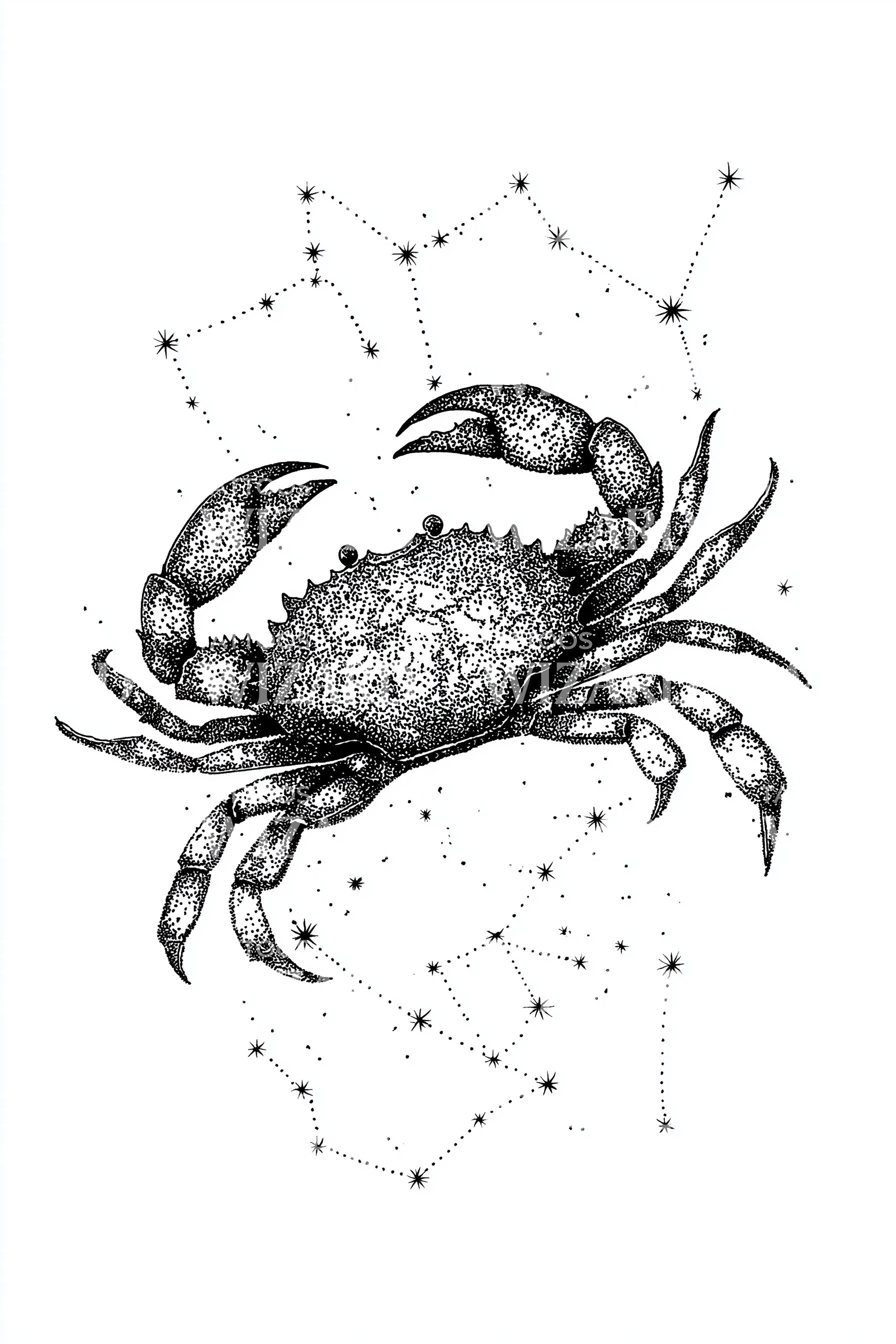 潜入这幅复杂点描纹身的宇宙海洋。这一独特设计融合了富有魅力的螃蟹,象征着星座巨蟹座,与天体星座图案相结合。非常适合希望庆祝并表达其宇宙联系的占星爱好者。