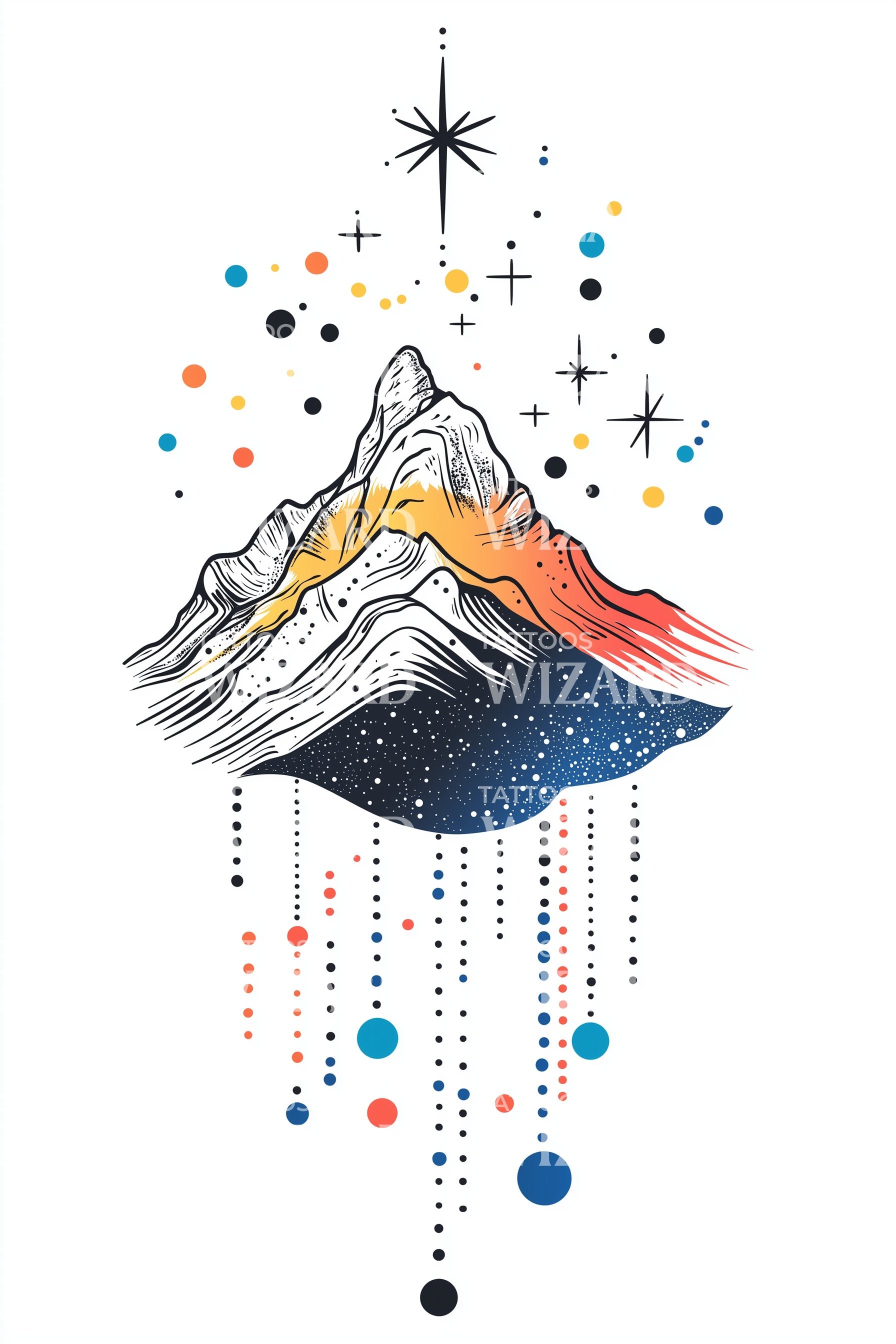 释放你内心的冒险精神,这款插画风格的尼泊尔灵感纹身设计。橙色光环环绕着巍峨的群山,映衬在星光点点的宇宙蓝夜空下,呈现出一种质朴而空灵的美感。用这件独特的作品为你的纹身收藏增添一抹色彩与神秘。