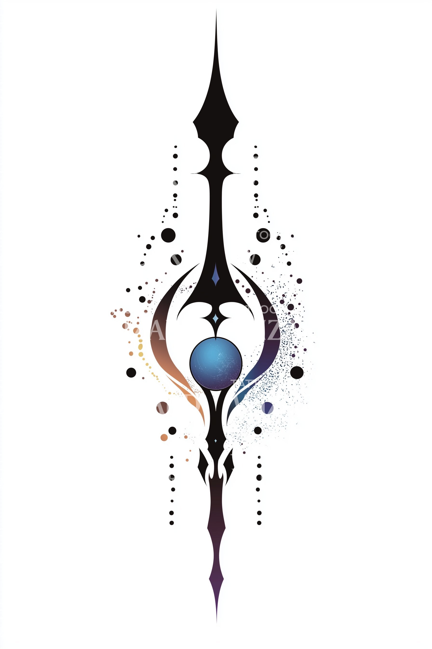 这是一款精美的装饰性纹身设计,融合了神圣的宇宙象征。垂直的主题展示了一支强力长矛结构,托举着一个飘渺的光球。精致的细节提升了整体的装饰性和仪式感。非常适合那些寻求视觉冲击力强且蕴含深刻神秘意义的纹身爱好者。