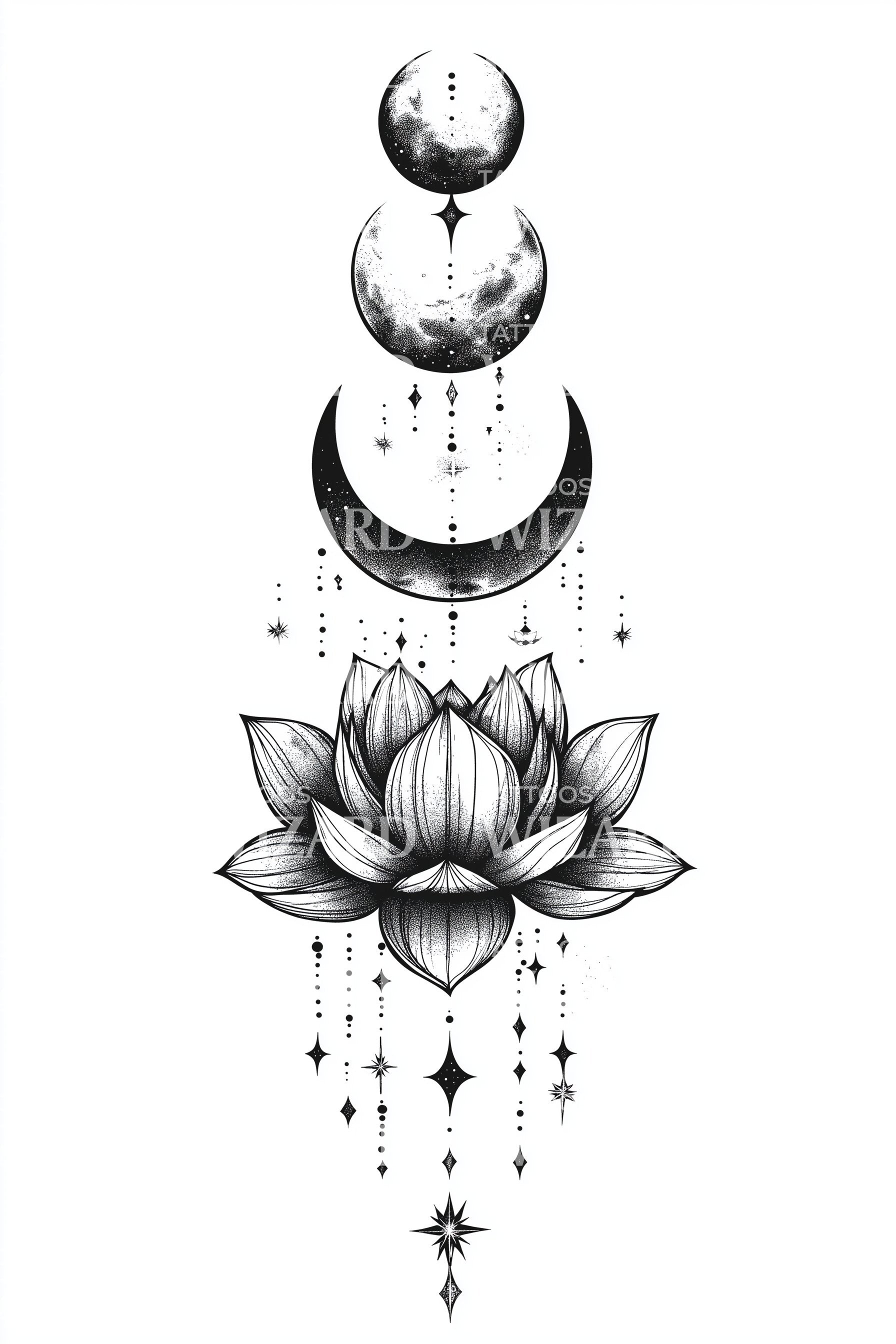 沉浸于宇宙优雅的装饰纹身设计。设计巧妙融合了莲花与星体元素,精美地融入了一个球体,宛如一颗行星。这是艺术的天体融合,捕捉了宇宙神秘而神圣的本质。非常适合仰望星空的你和梦想家。