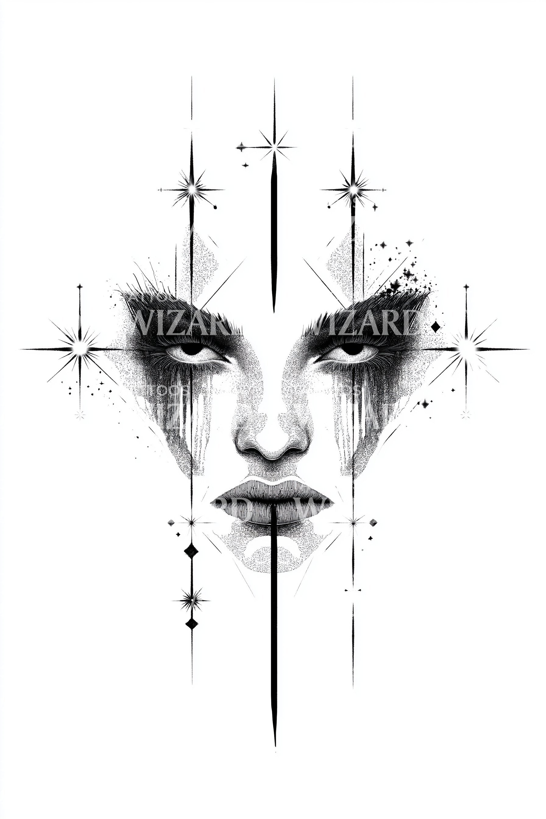 Starlit portrait etched in fine stipple and razor black lines, a mystic face framed by radiant stars and gravity-slim constellations. Tears trail as comets, carrying sorrow into light. Symbol of resilience and cosmic intuition, it clothes the wearer in calm power, night-born clarity, and fierce grace.