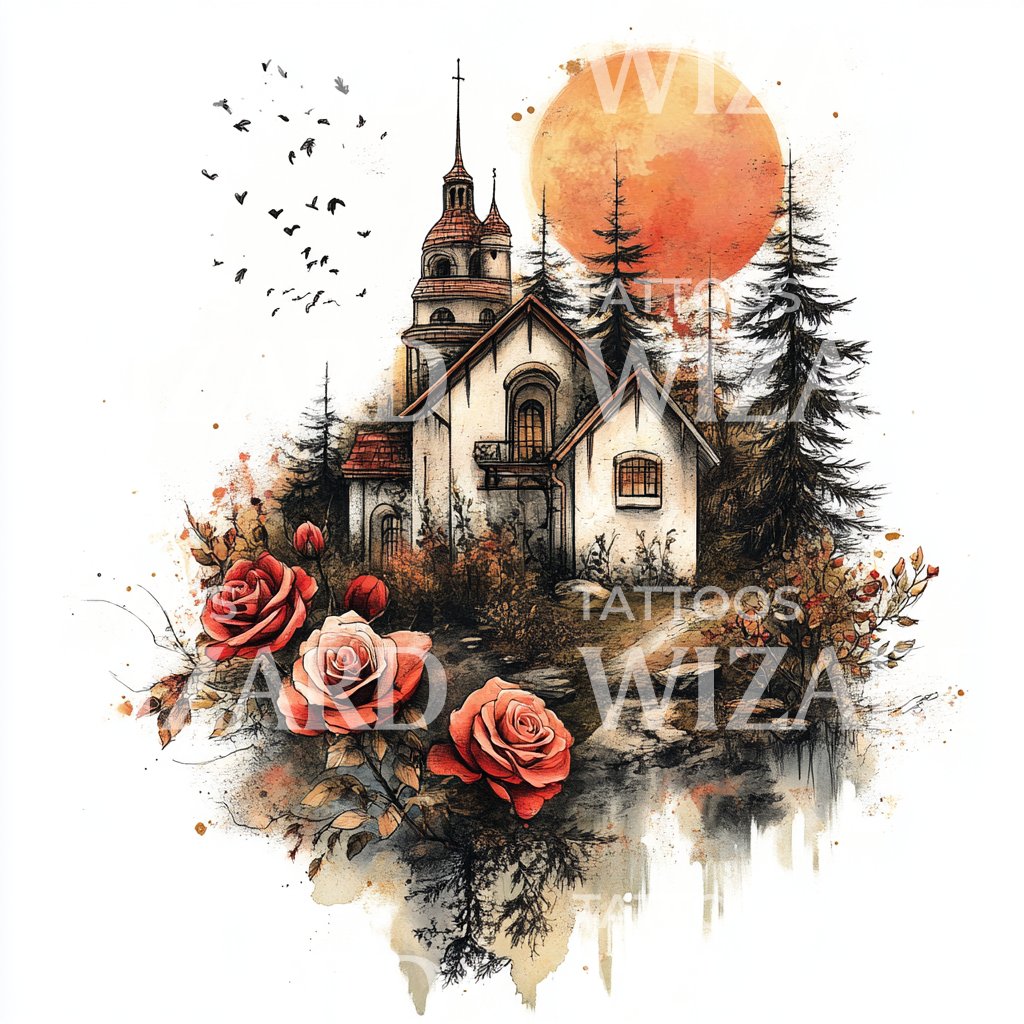这个迷人的纹身设计展现了一个梦幻般的风景,一座古朴的小屋坐落在盛开的玫瑰花丛中。浪漫的氛围被迷人的日落背景色彩所增强。这个插图设计让你可以将梦想穿在身上,完美表达了逃避现实和浪漫的情感。