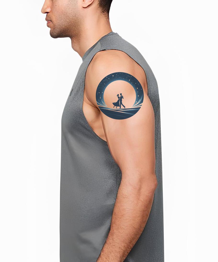 用这个模糊的装饰性月亮二重奏纹身设计来拥抱夜晚。艺术作品巧妙地将天体月亮与神秘的十美分概念交织在一起。这是超凡魅力与世俗符号的完美结合,为你的身体艺术增添了一丝神秘和独特。