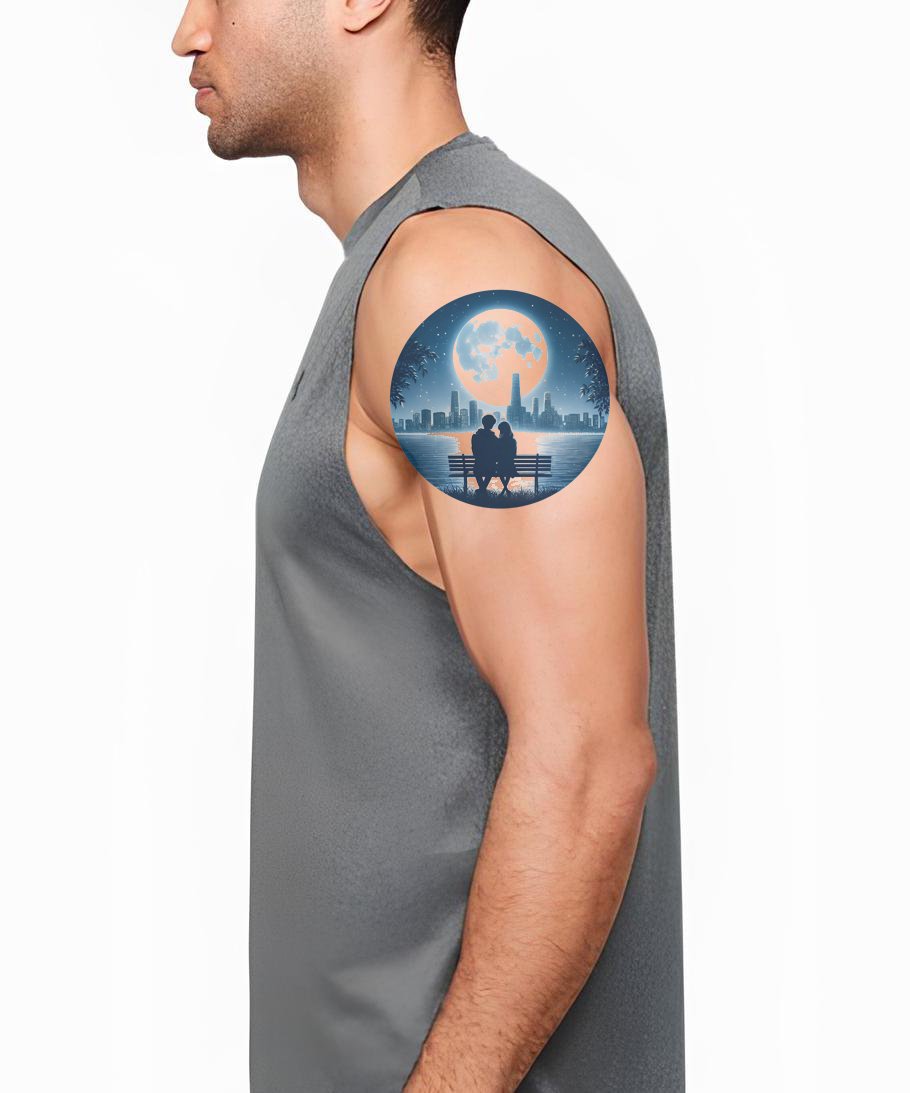 沉浸在这个插图纹身设计的氛围中。捕捉一对情侣在海岸放松的宁静,被远处城市的夜晚魅力所吸引。这是宁静与城市魅力的优雅融合,完美唤起一种平静和归属感。