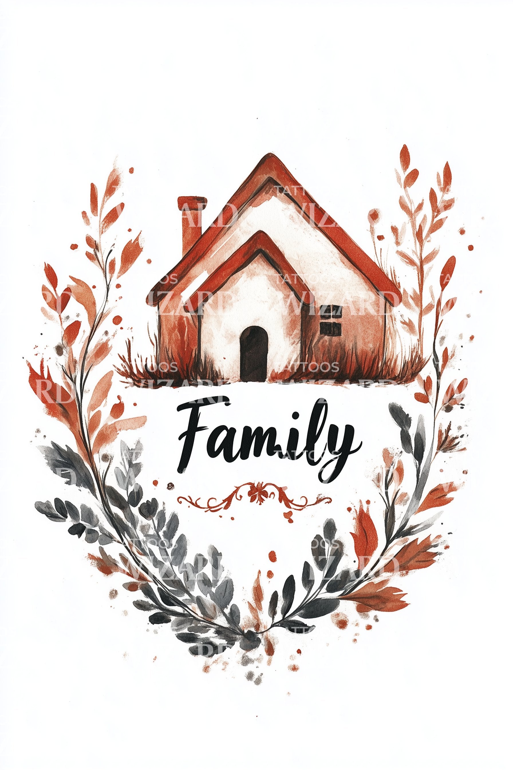 Hearth-warm watercolor cottage nests within a leafy wreath, its terracotta roof and shadows evoking a cozy house. Hand-lettered Family anchors the heart. The cottage symbolizes home and belonging, while the wreath circles loyalty and growth. Wearing this feels like carrying family close, a gentle hush of safety and roots.