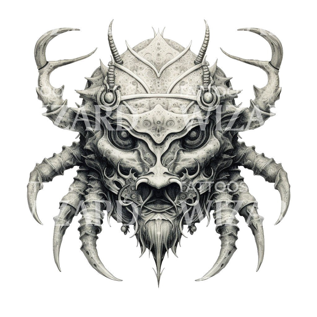 沉浸在这个黑灰色纹身设计的黑暗魅力中。精心制作的武士蟹被黑色图像所包围,展现出一个神秘的面具。JulianFace粗犷的风格体现了一种神秘的吸引力,使其成为吸引那些喜欢黑暗、阴郁美学的个体的引人注目的纹身选择。