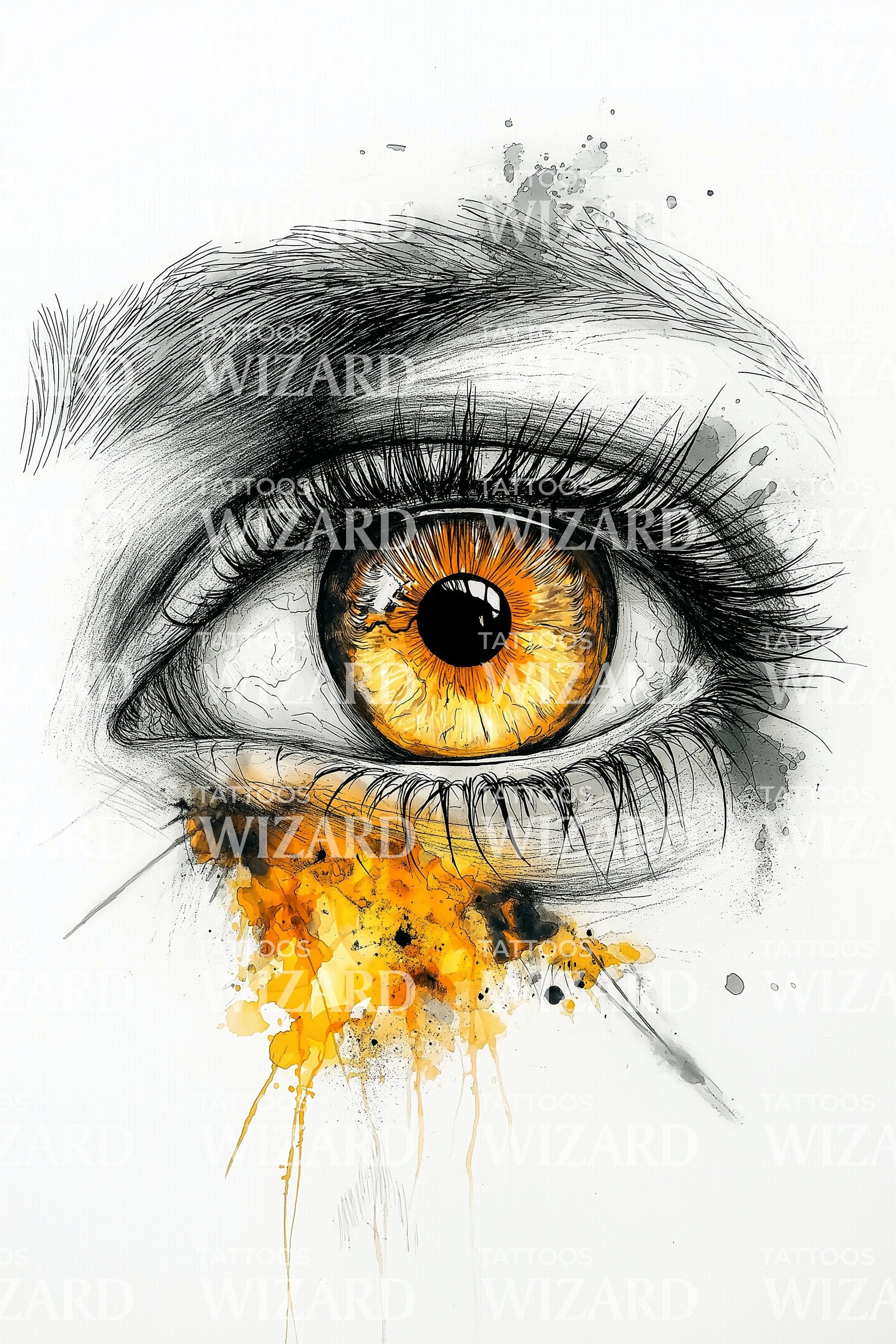 沉浸于这款水彩纹身设计迷人的魅力中。仿佛破裂的虹膜,那引人注目的眼睛细节从充满格调的橙色飞溅中跃然而出。它以鲜艳的色彩和独特的风格,成为一件壮丽的艺术宣言。