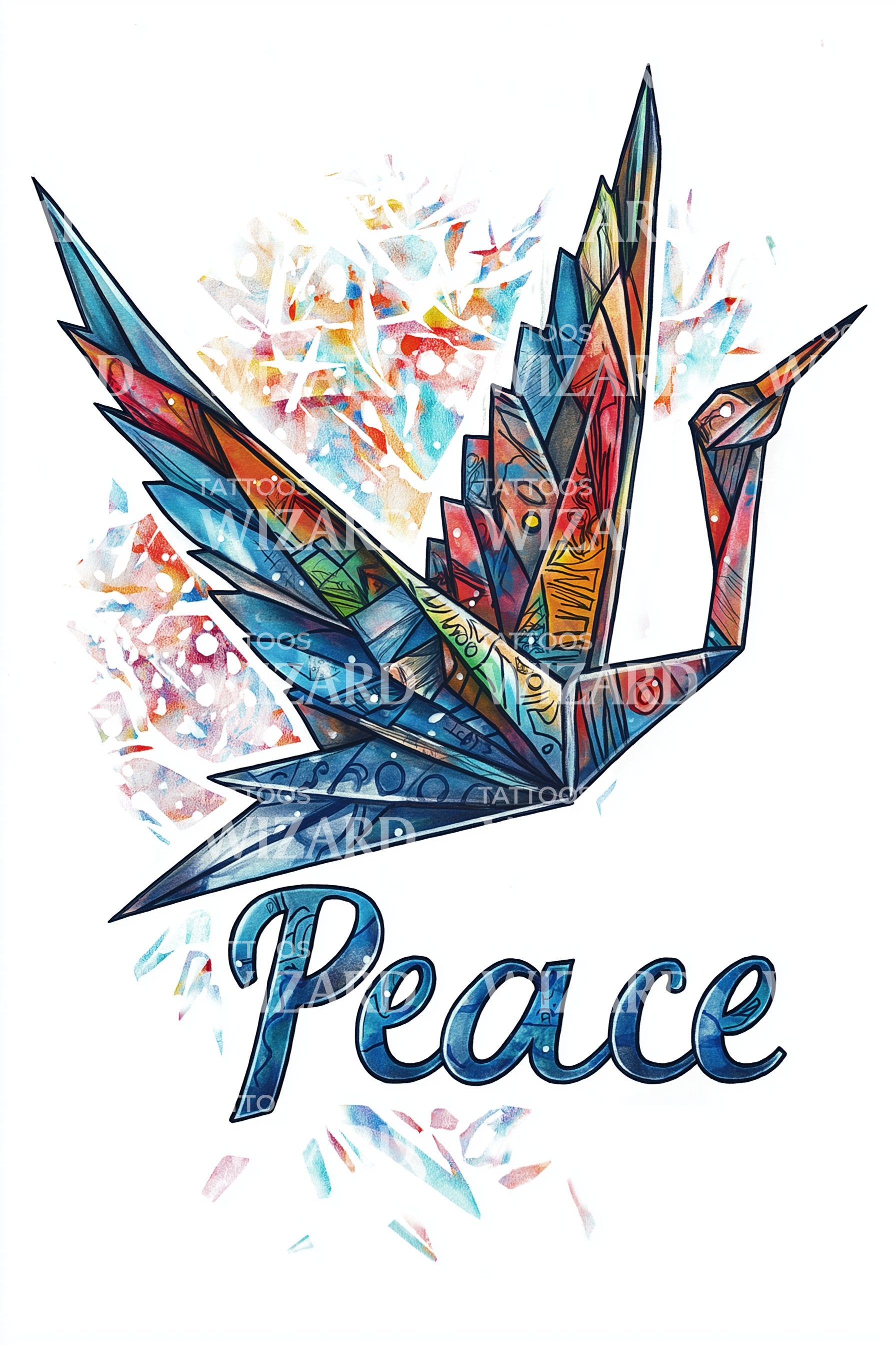 Watercolor facets form a soaring origami crane, edged in ink and surrounded by airy splashes, with Peace flowing beneath in deep blue script. Japanese symbolism folds within each wing, echoing senbazuru, speaking of hope and healing. Wearing it feels like open sky, gentle freedom, and calm breath returning.