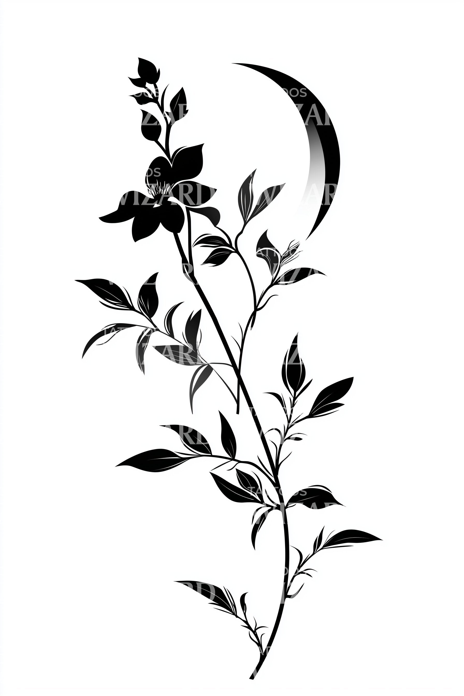 这款引人注目的黑色纹身设计巧妙地将甜美的茉莉花与精致的新月交织在一起。它是夜晚魔力与花卉浪漫主义的完美融合。这件独特的作品让你在肌肤上承载月光之夜的魅力,散发出一种黑暗而迷人的魅力。