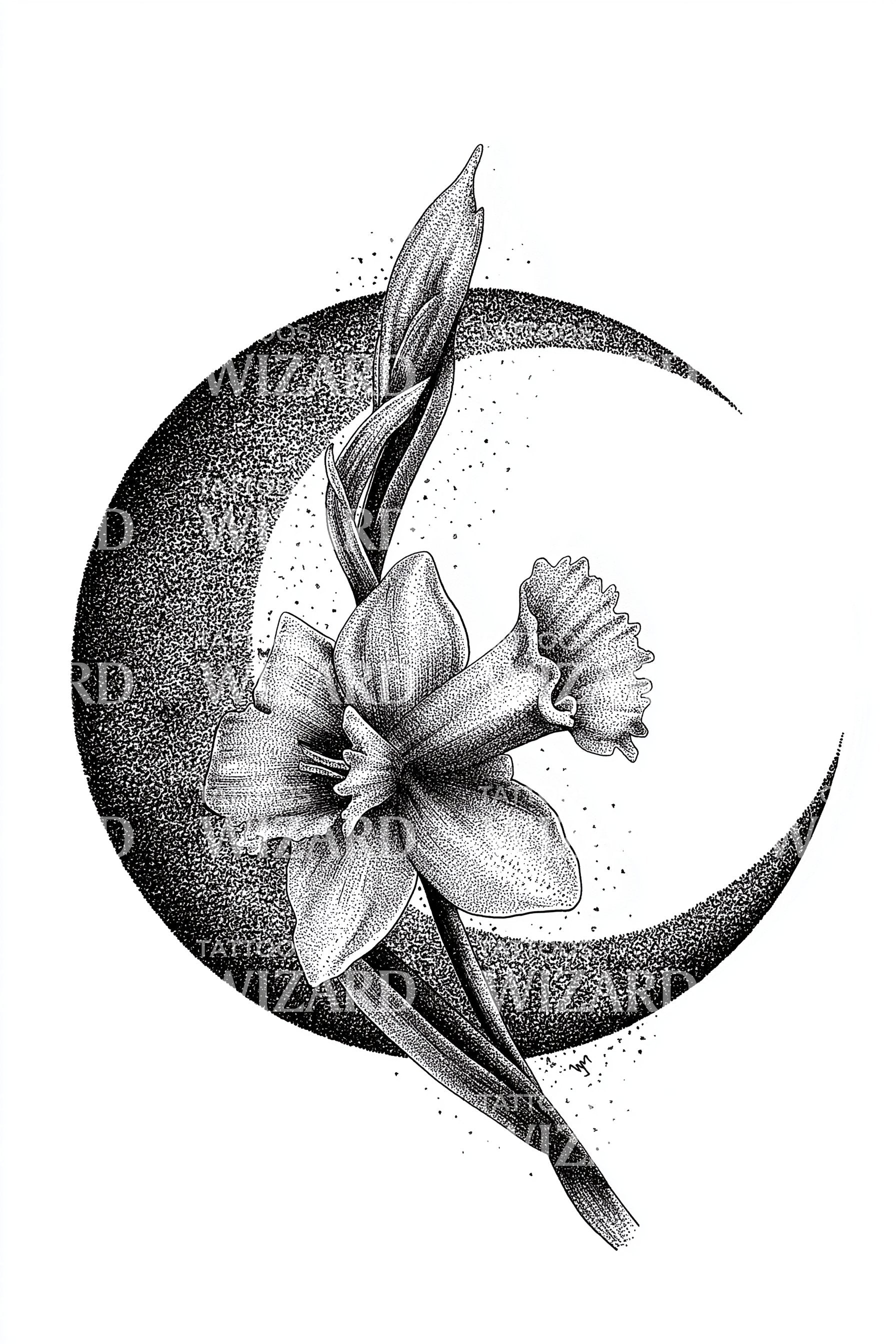 释放你内心的天体神性,这款精细的点描纹身设计。水仙花与新月的优雅融合,展现迷人的对称美感。大胆的黑色线条突显花朵的绽放与夜晚的光辉,完美契合热爱细节与深刻象征意义的你。