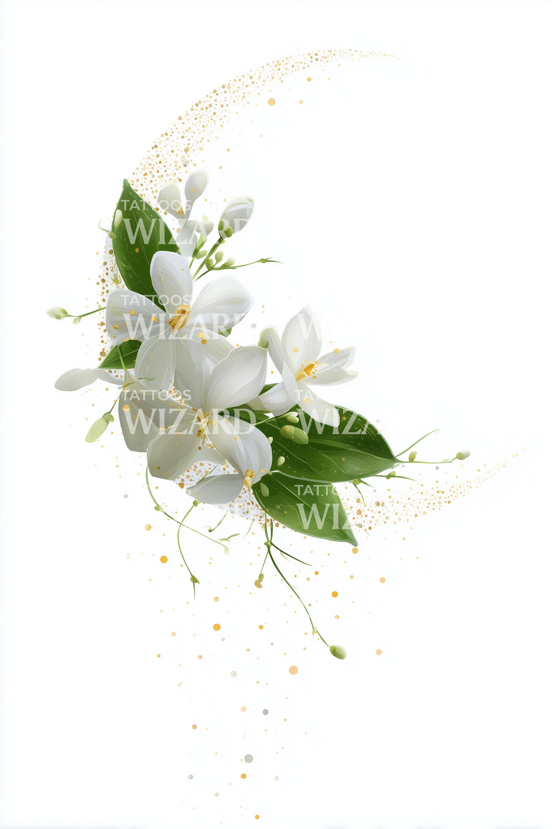 沉浸于这款精致水彩纹身设计中所蕴含的天体之美。它巧妙地将柔和的新月与精细的茉莉花纹理相结合,融合了自然与神秘元素。这款迷人且富有女性气息的设计,定能为您的艺术表达增添一抹奇幻色彩。