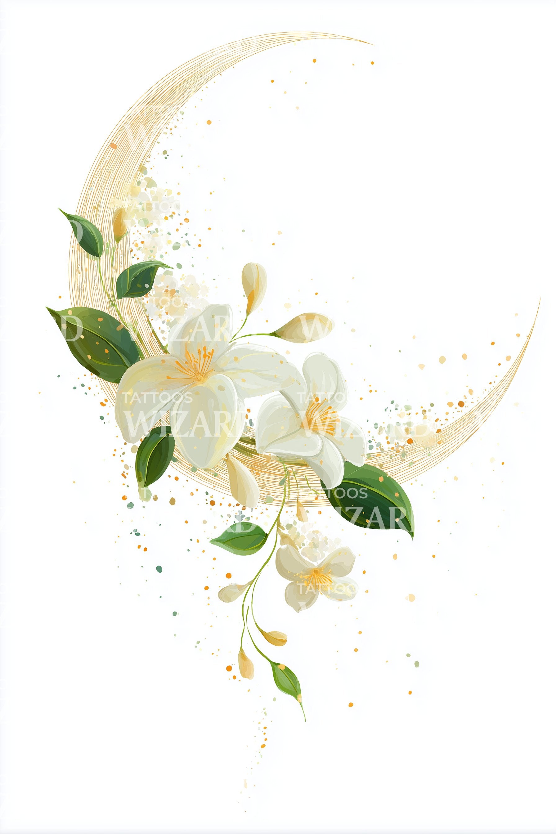 释放你天体的精神,这款复杂的纹身设计巧妙地融合了新月与盛开的木兰花。以迷人的水彩光辉呈现,这一设计结合了花卉与月亮元素,创造出引人注目的个性表达。非常适合神秘纹身爱好者。