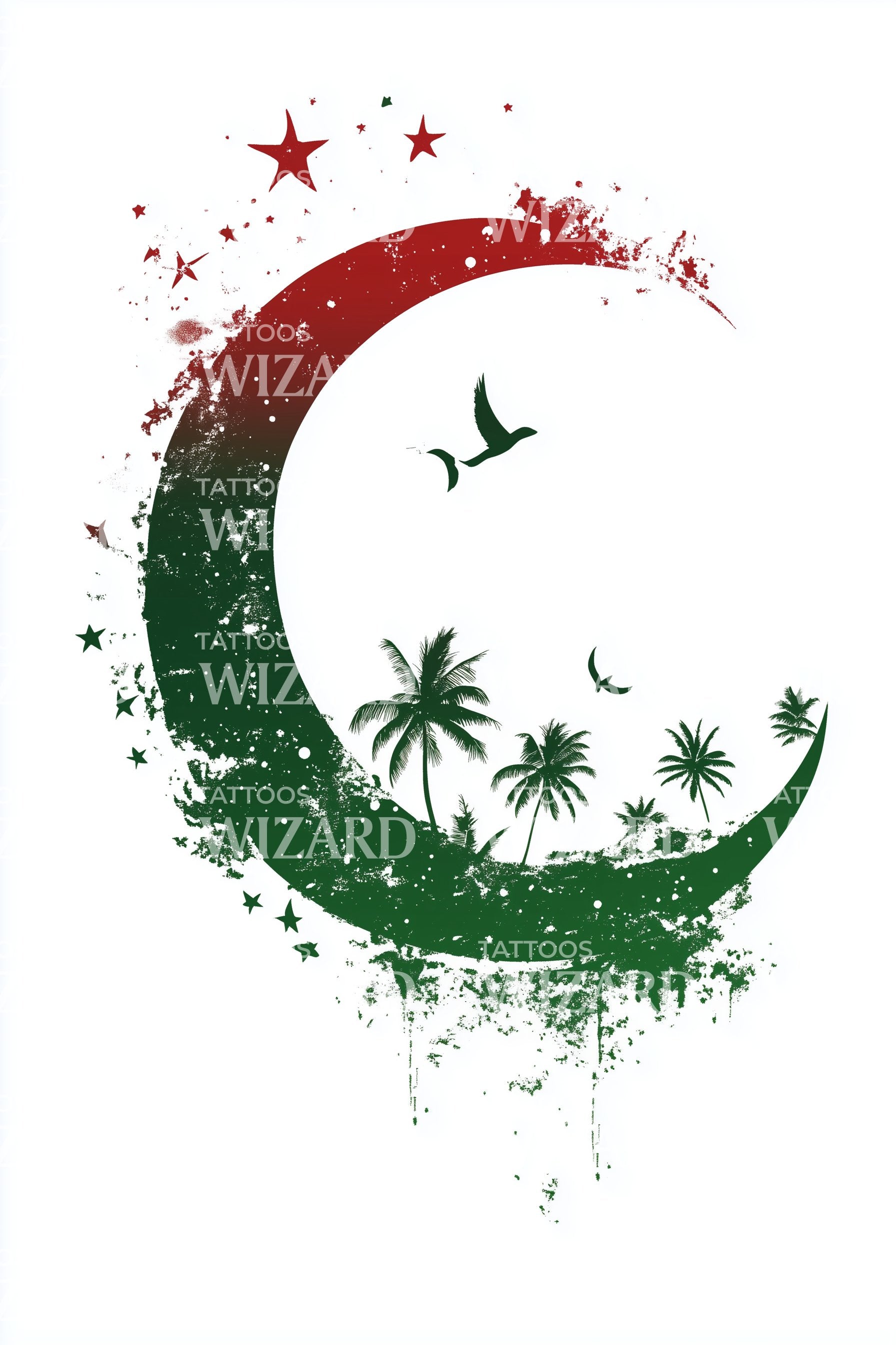 沉醉于这款水彩纹身设计的迷人之美,设计中一弯新月静卧于宁静的棕榈叶间,点缀着可爱的鸟儿。柔和的绿色调与星光点缀的神秘夜空相结合,赋予这件作品一种奇幻梦幻的气质,你一定会喜爱。