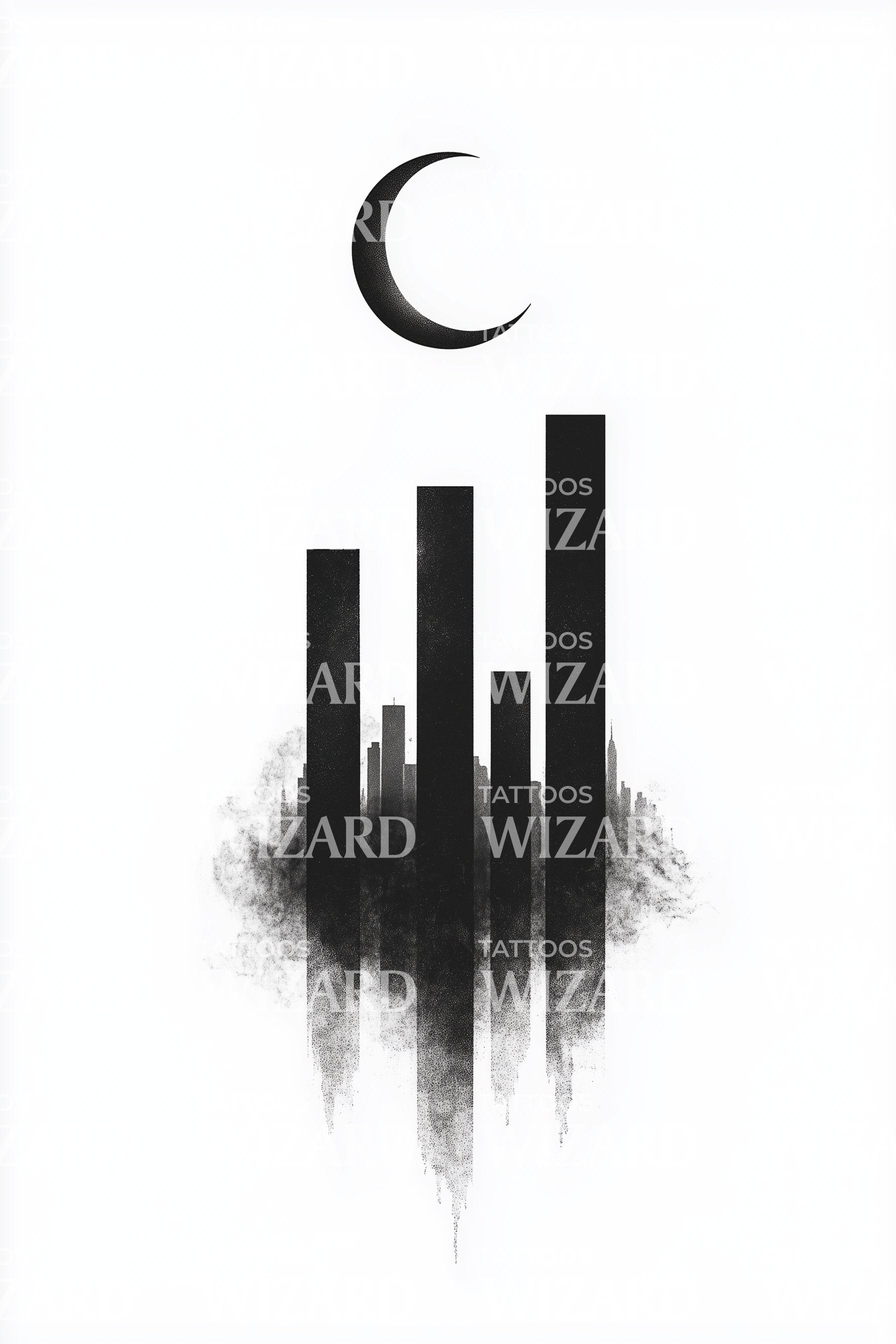 午夜几何遇见现代极简主义;高耸的黑色条纹在新月下构成抽象的城市。月弧象征周期;塔楼体现夜晚的雄心。佩戴它,感受宁静而坚定,带有锋芒。理想位置:前臂或小腿呈现垂直流动,脊柱传递能量,肋骨展现私密天际线。