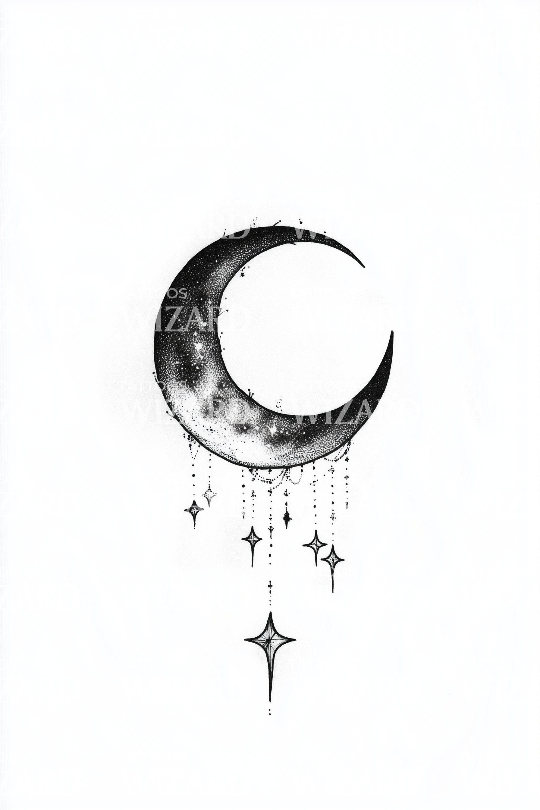 Fineline crescent cradled in soft stippling, with tiny stars and beadlike chains drifting below, glimmering like night jewelry. Symbol of cycles, intuition, and quiet guidance, it charms with delicate balance. Wearing it feels like keeping a pocket sky, inviting calm, resilience, and luminous beginnings, protection, wonder, and serenity.