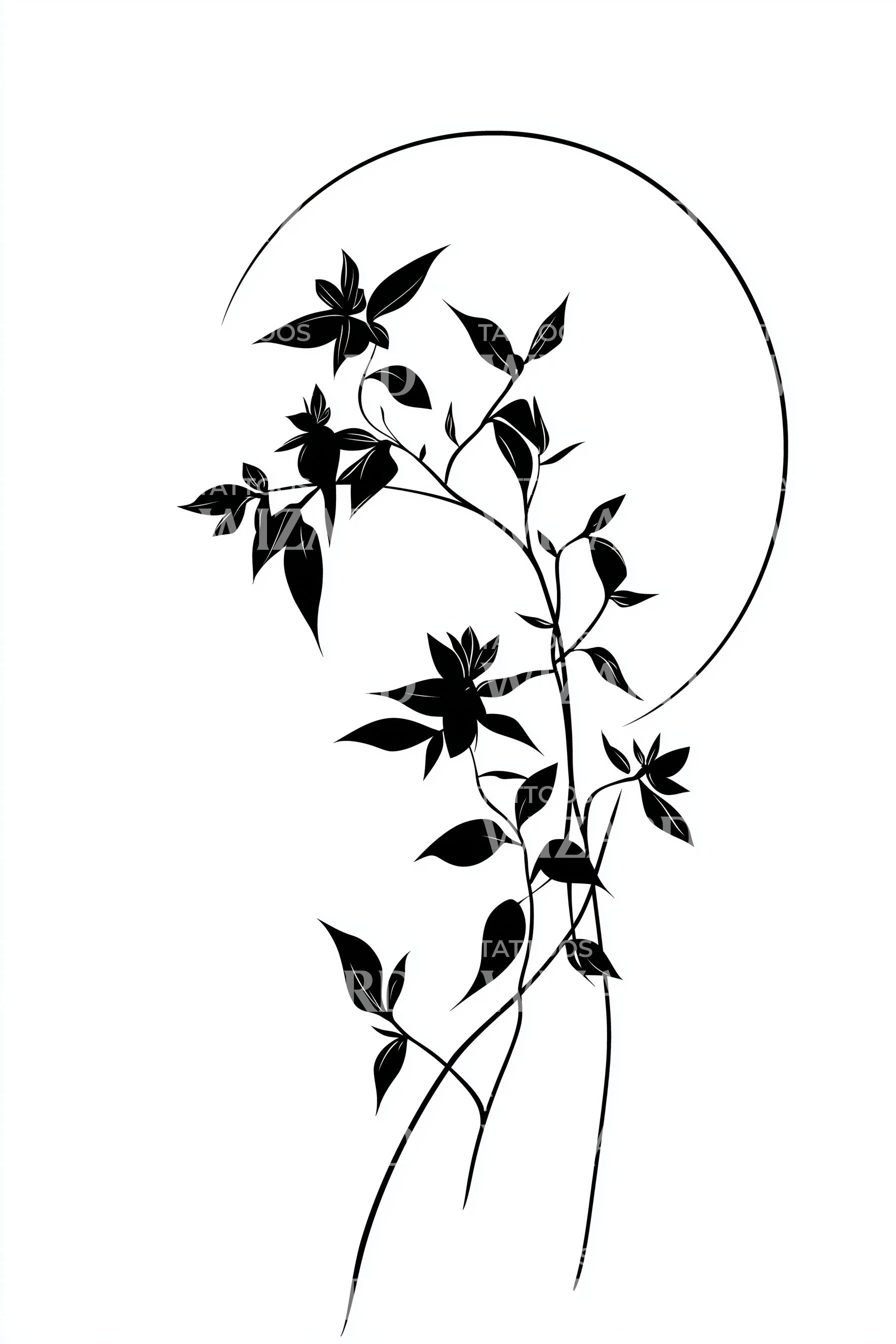 沉浸于我们细线纹身设计的细腻魅力。展现出藤蔓、新月与花卉元素的迷人融合——通过精致的线条工艺紧密相连。这是一种散发优雅气息的植物美学,准备为您的纹身收藏增添一抹精致的时尚感。