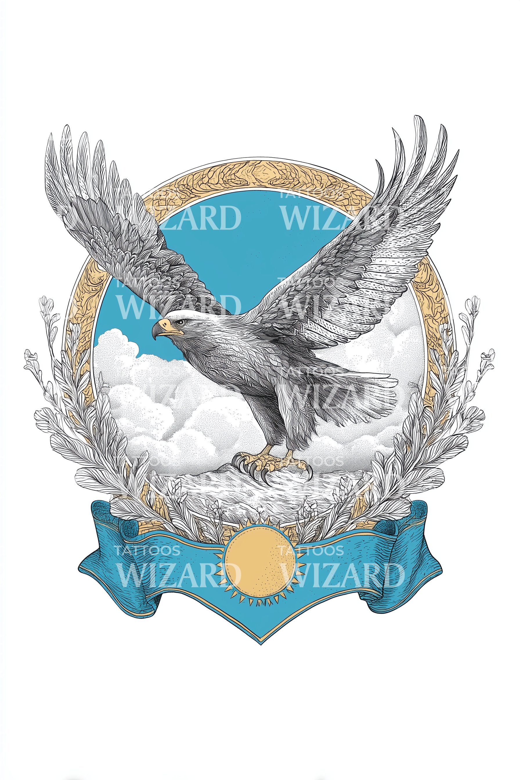 拥抱您的爱国精神,这款精致的装饰性纹身设计描绘了哈萨克斯坦国徽的元素。醒目的青绿色点缀完美突出雄鹰翅膀上每一根羽毛的细节。象征意义深远且美观,是哈萨克斯坦国旗的艺术表现。