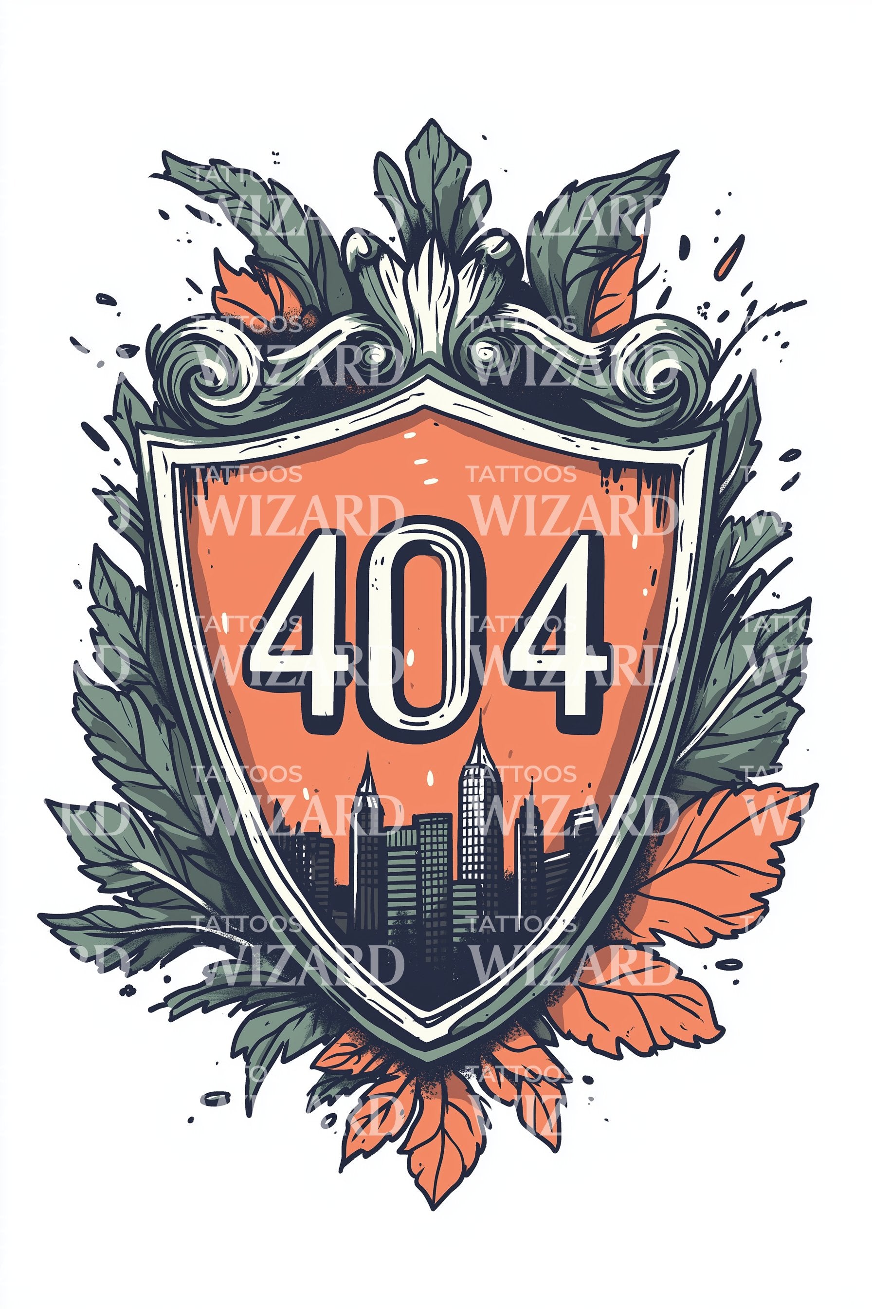 Regal shield in terra-cotta orange, wrapped in scrolling filigree and laurel leaves, frames a dark skyline and bold 404. This crest honors Atlanta heritage, the shield guarding roots while the skyline reaches forward. Floral flourishes whisper growth and grace, leaving the wearer feeling steadfast, noble, and homebound.