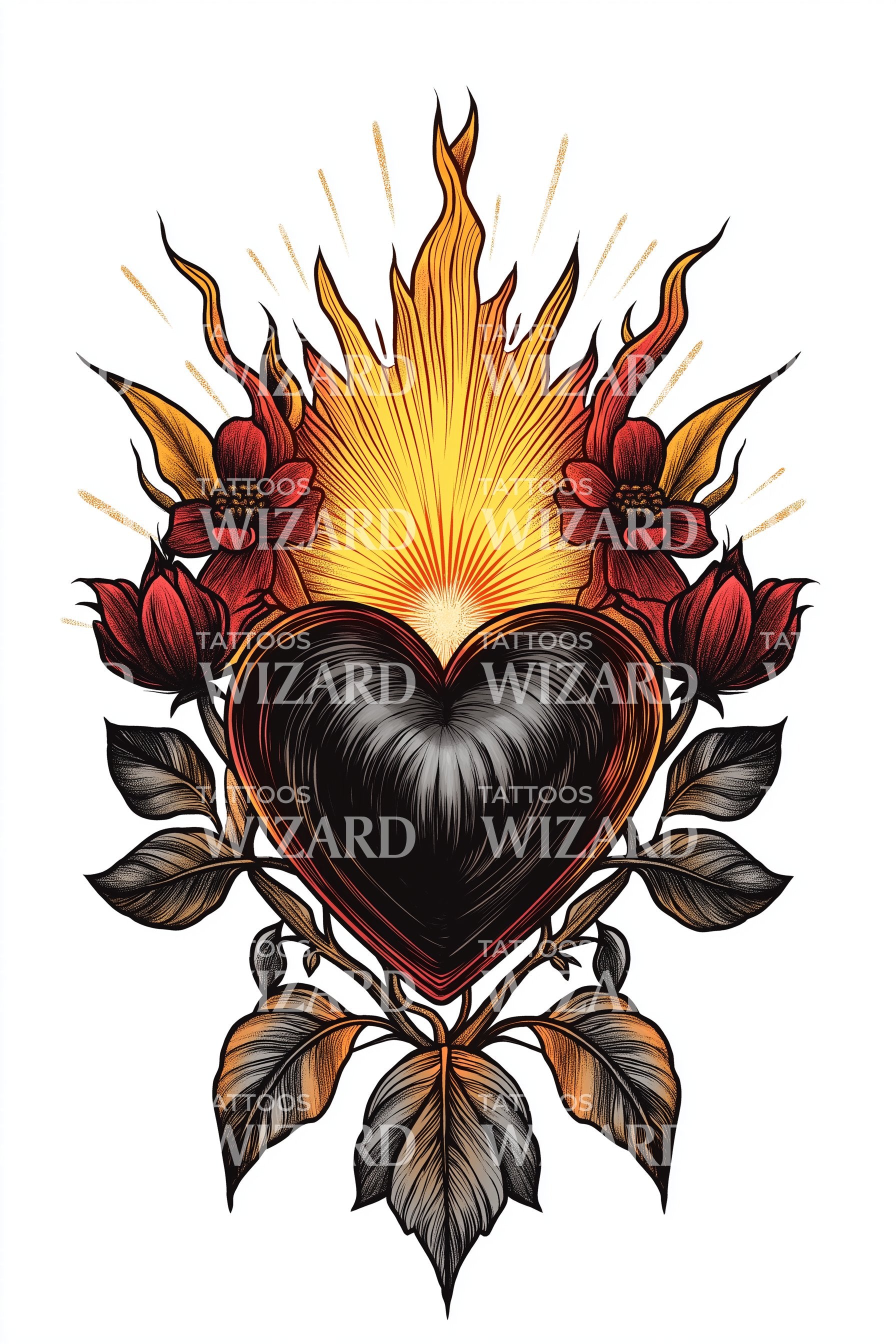 沉浸于这款新传统纹身设计所带来的力量与生动表达的交响乐中。它以视觉冲击力十足的图案重新演绎,融合了燃烧着热情火焰的炽热猩红之心,周围环绕着精致设计的玫瑰——这是坚定爱意与炽烈决心的真实体现。