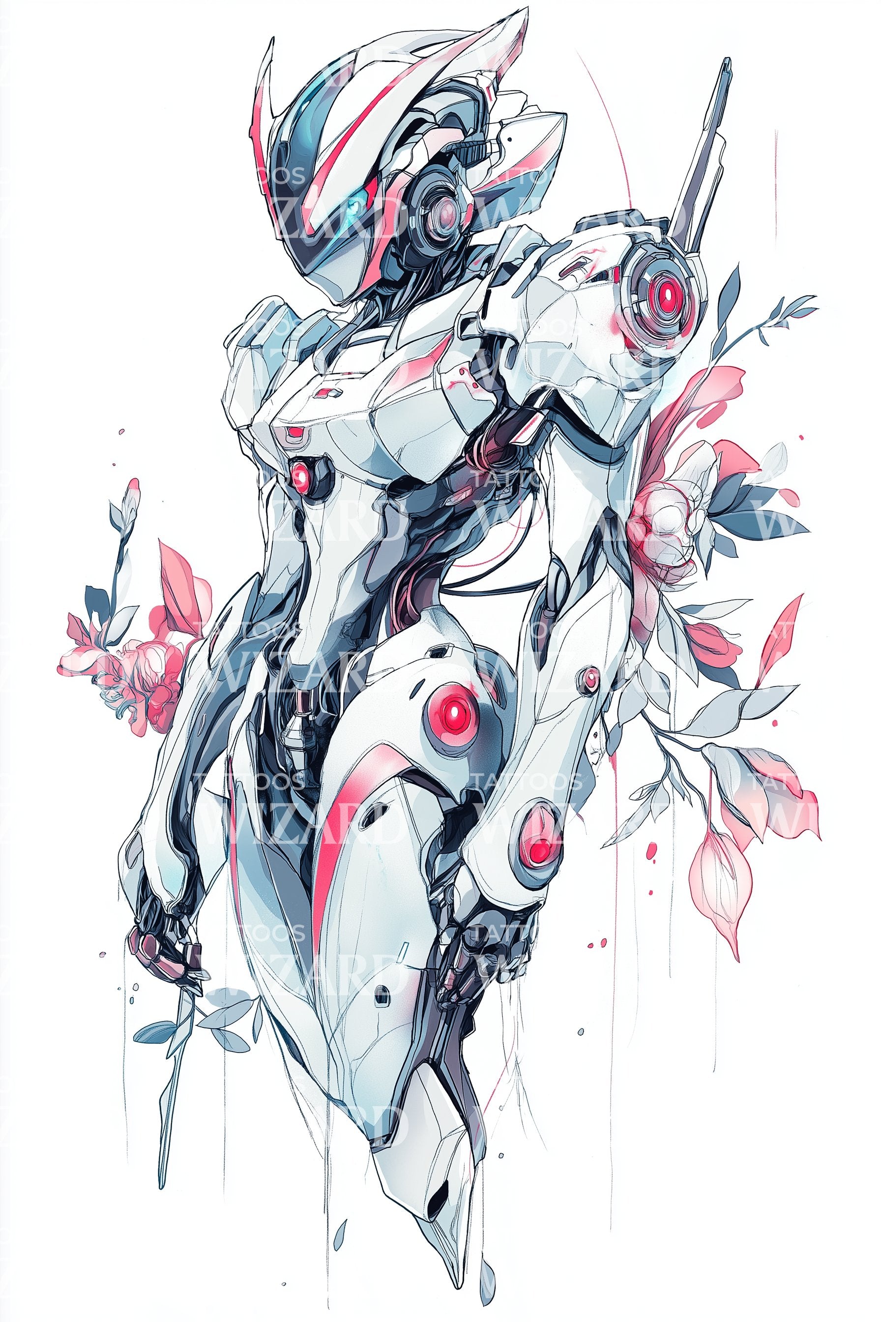迈入未来,感受这款机甲灵感纹身设计。作品融合了深红色调与赛博美学,展现出一位强悍、身披铠甲的女性形象,动态十足。这件独特的插画作品完美捕捉了力量、科技与女性能量的结合。非常适合热爱前卫艺术的你。