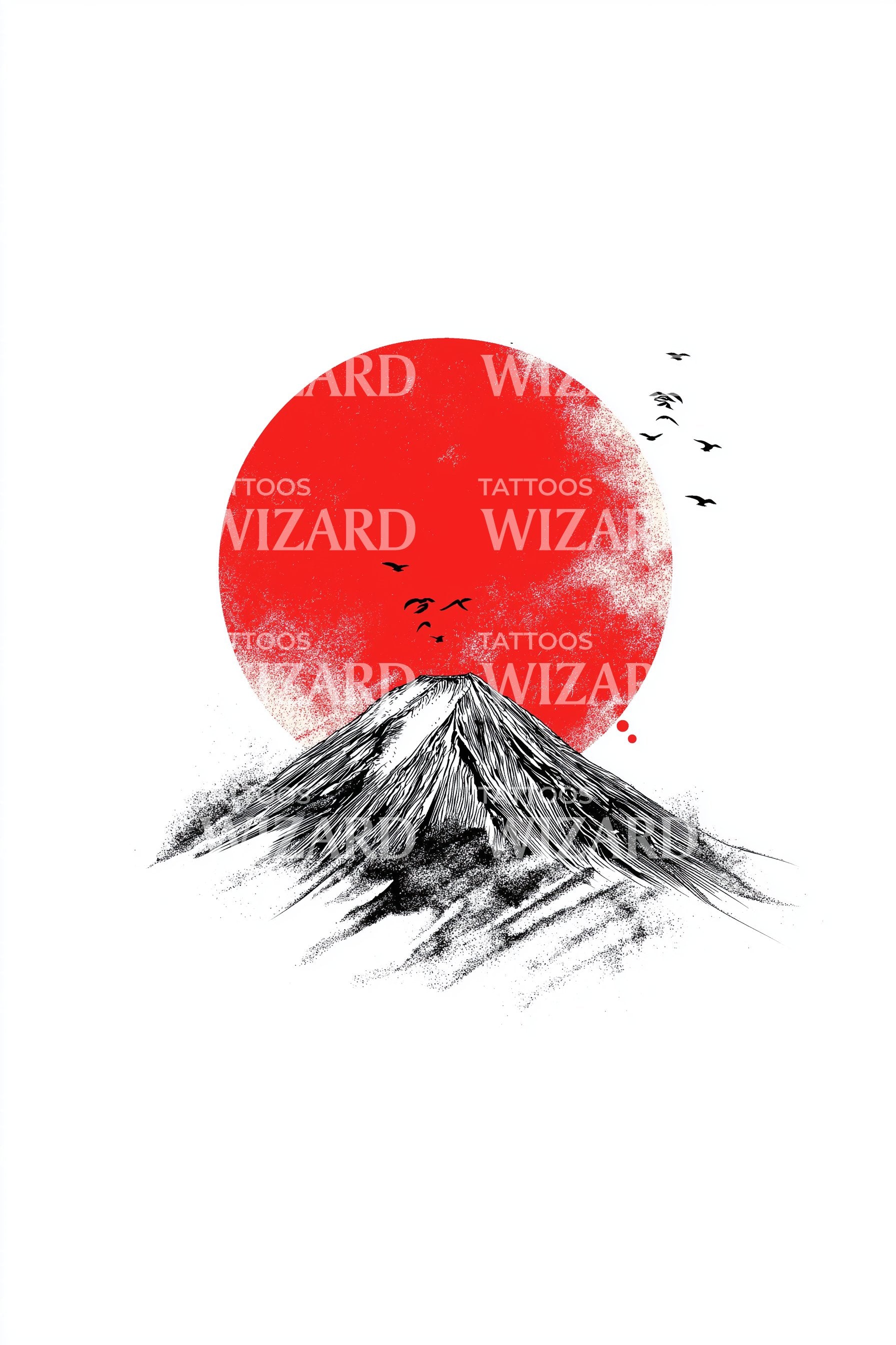 用这款艺术水彩纹身设计点亮你的个性。画面描绘了一轮迷人的深红色太阳,冉冉升起于壮丽的山脉景观之上,每一处细节都以细腻的笔触精心描绘。此设计体现了美丽的生机,捕捉了自然的魅力与动人色彩。非常适合充满热情的冒险者。