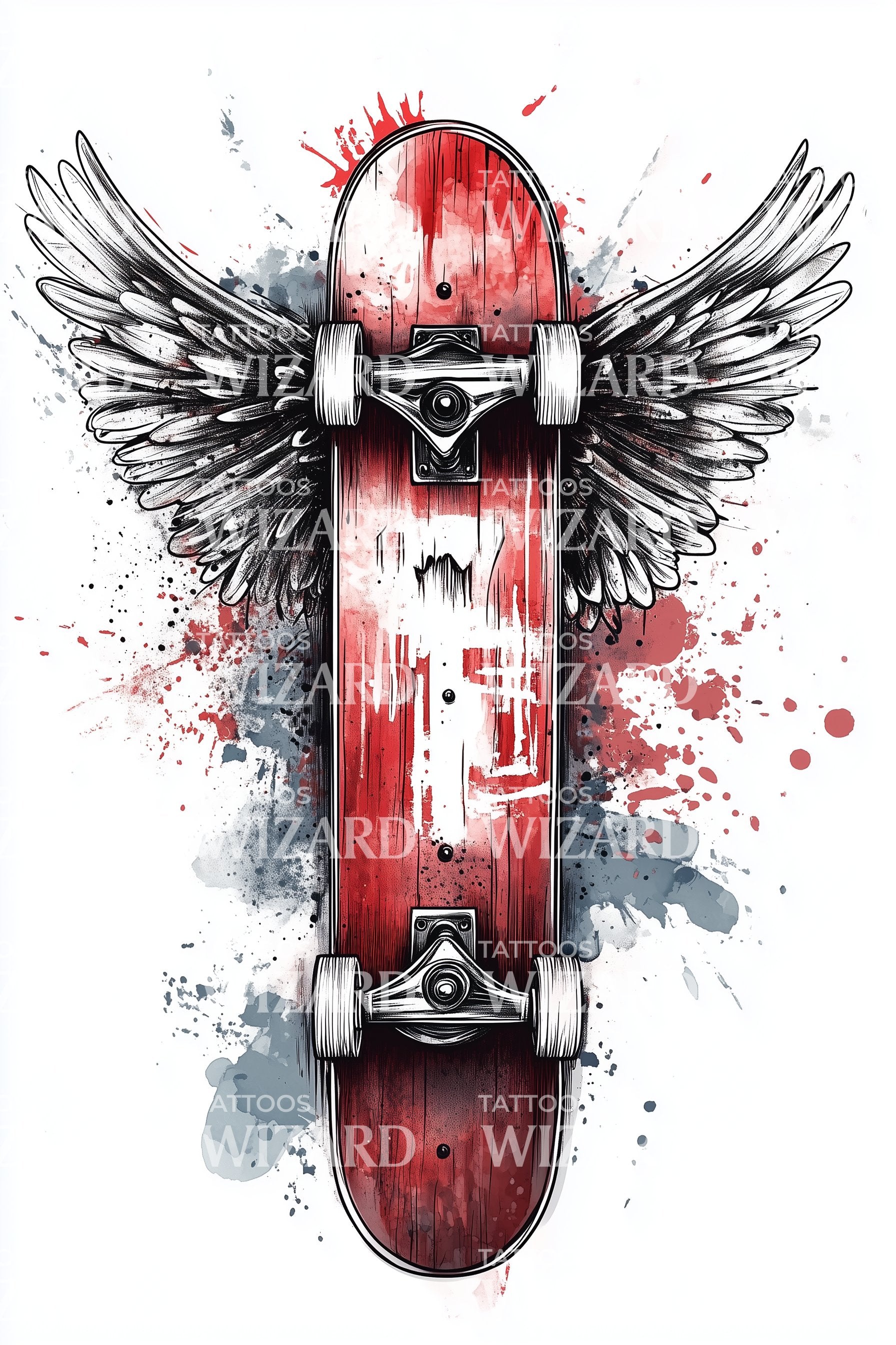 沉浸于充满活力的脏酷文化,这款前卫的新潮纹身设计。以鲜艳的红色滑板为主角,配以强劲的翅膀,散发出极致的能量,完美契合每位肾上腺素爱好者。这是对每次滑板冒险中激情与叛逆的视觉诠释。