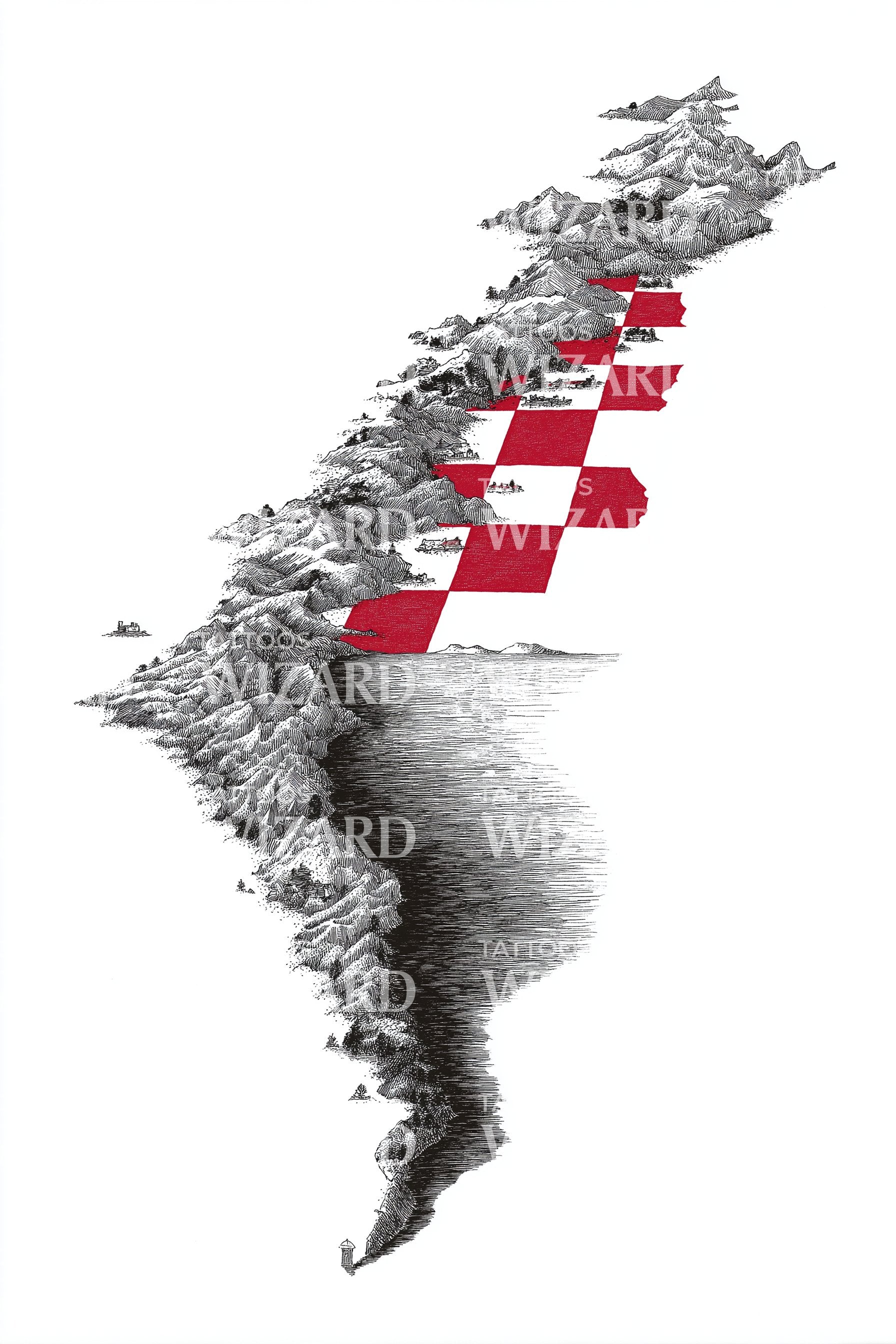 沉浸于克罗地亚海岸的氛围中,这款素描纹身设计展现了克罗地亚国旗上的红白格子图案,唤起民族自豪感与海岸的宁静。这是对国家迷人美景与文化遗产的完美致敬。