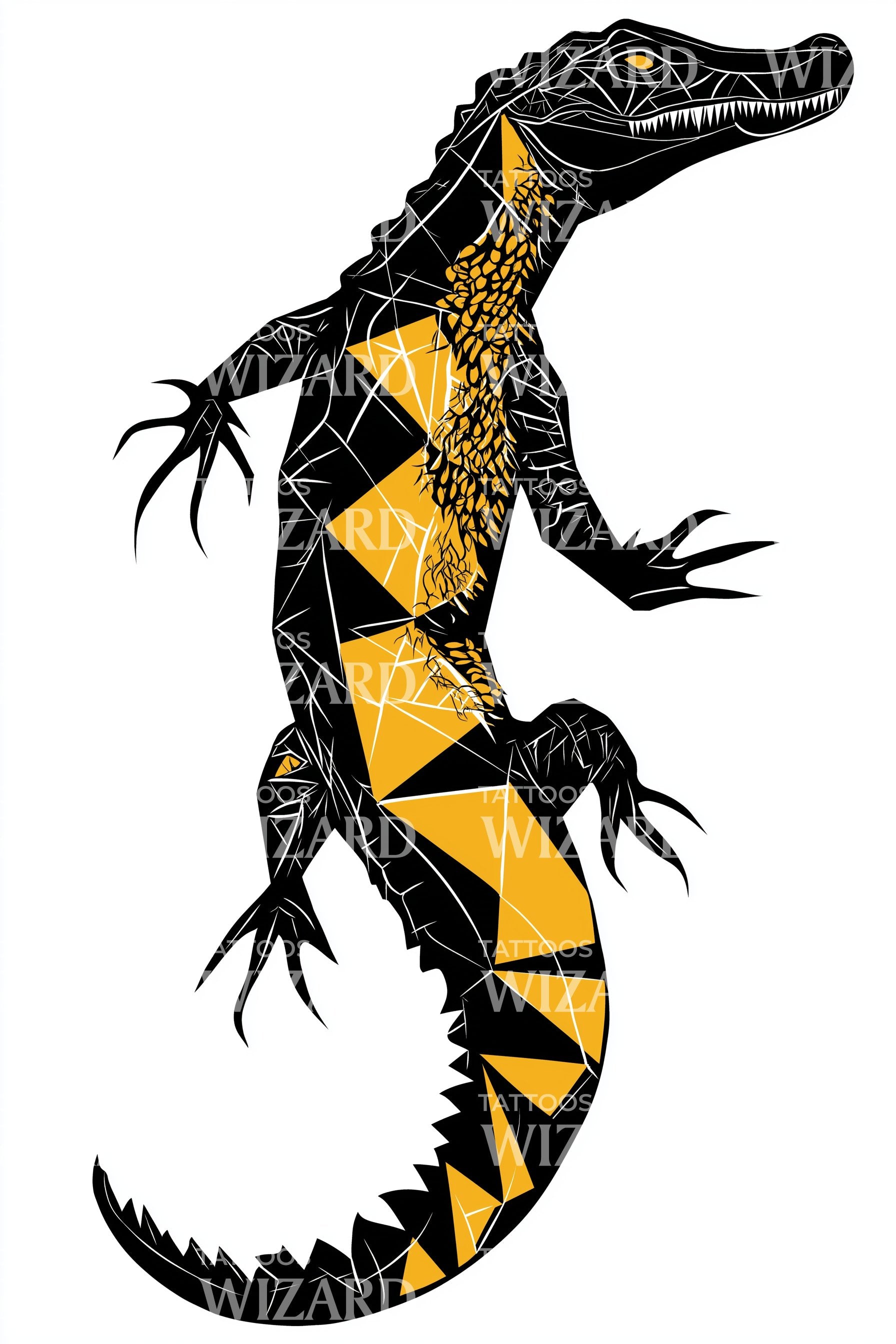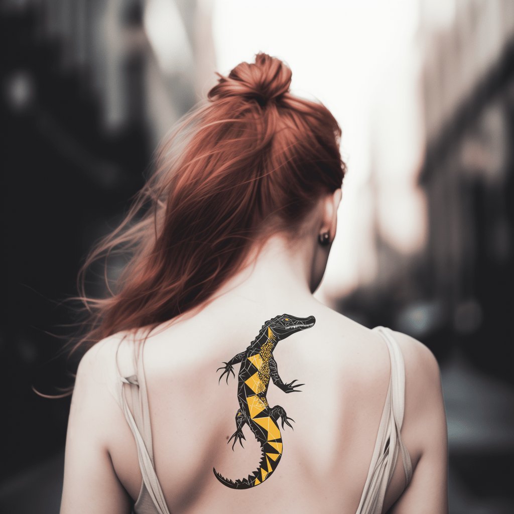 通过这款几何鳄鱼图腾纹身,释放原始力量。交错的三角形雕塑出爬行动物的护甲,平衡了对称与锋芒。大胆的黑色线条与醒目的黄色点缀形成对比,营造出深度与动感。非常适合前臂、小腿或背部纹身,象征着坚韧、警觉,以及古老的水域与持久的蜕变。