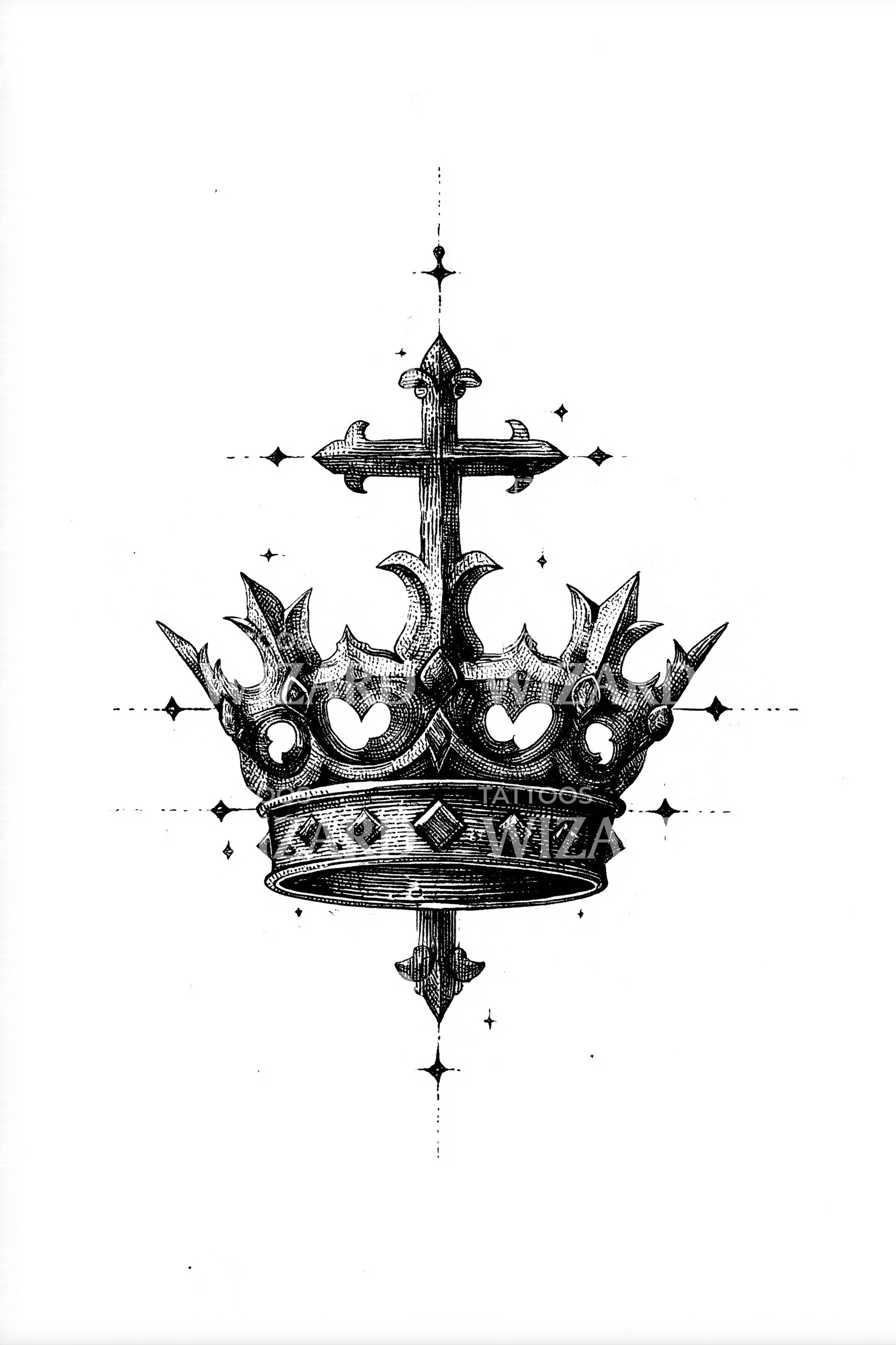 沉浸于神圣象征的世界,这款精致设计的纹身以点描技法展现了一个华丽的十字架冠冕,作为信仰与精神虔诚的深刻表达。其精细的细节必将吸引目光,完美体现力量与坚定信念的象征。