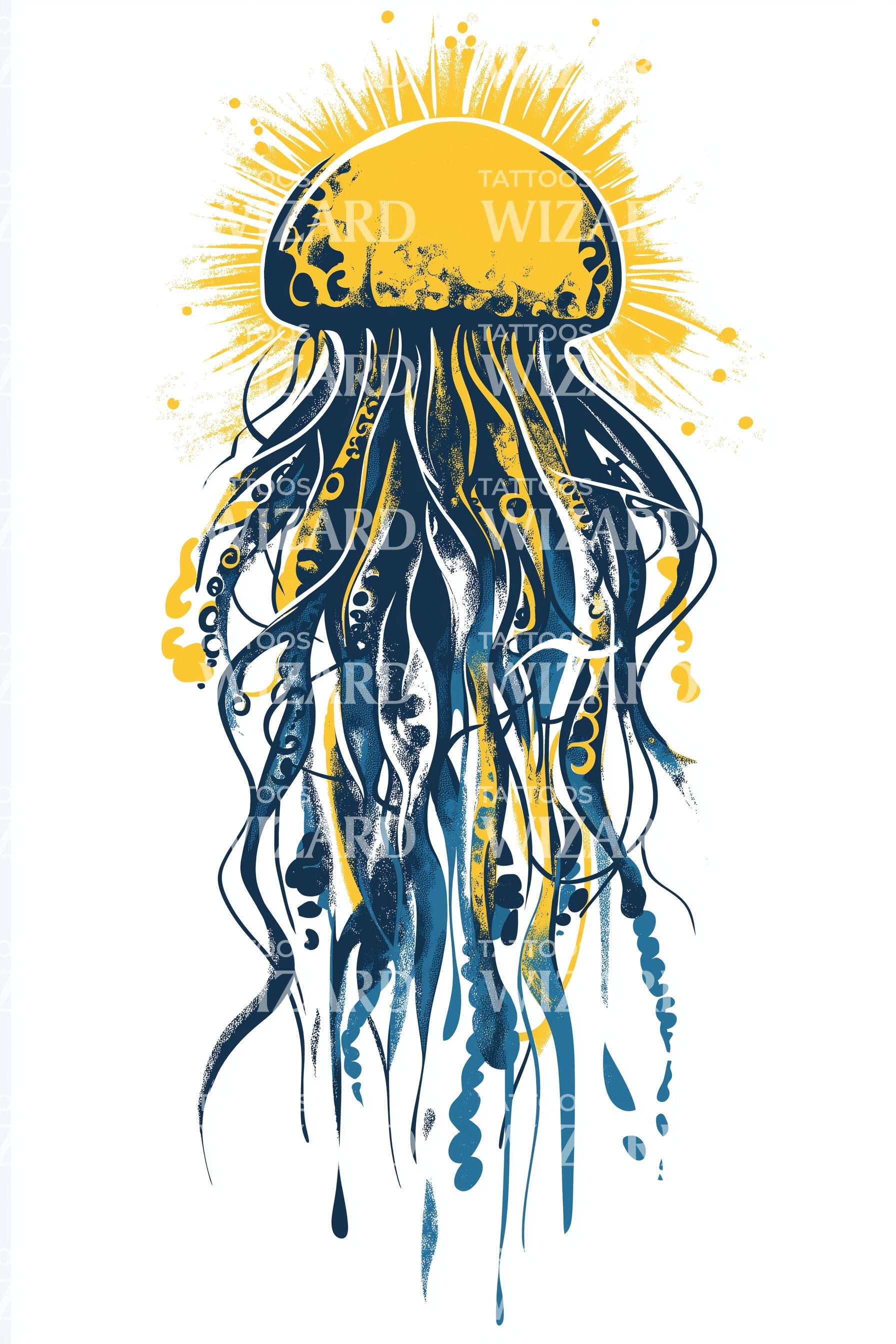 随着这款水彩风格的水母纹身,漂入深海,浸润在明亮的蓝色中,点缀着闪烁的金色。流动的触须轻盈摇曳,捕捉海洋宁静的脉动。空灵的海洋灵感艺术,轻盈而生动——完美适合那些每天心怀大海的人。