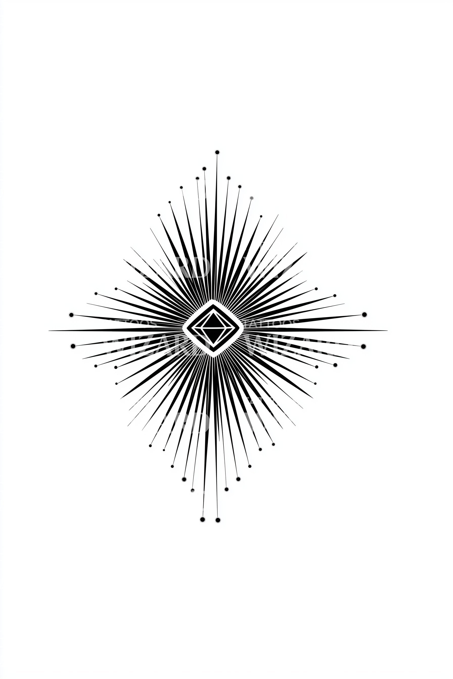 Ornamental starburst sigil with a faceted crystal core radiates needle-fine beams, each tipped with delicate dots like celestial ornaments. The gem symbolizes clarity and inner worth; the halo evokes protection and awakening. Wearing it feels luminous, centered, and brave, a quiet shine guiding daily choices with sacred elegance.