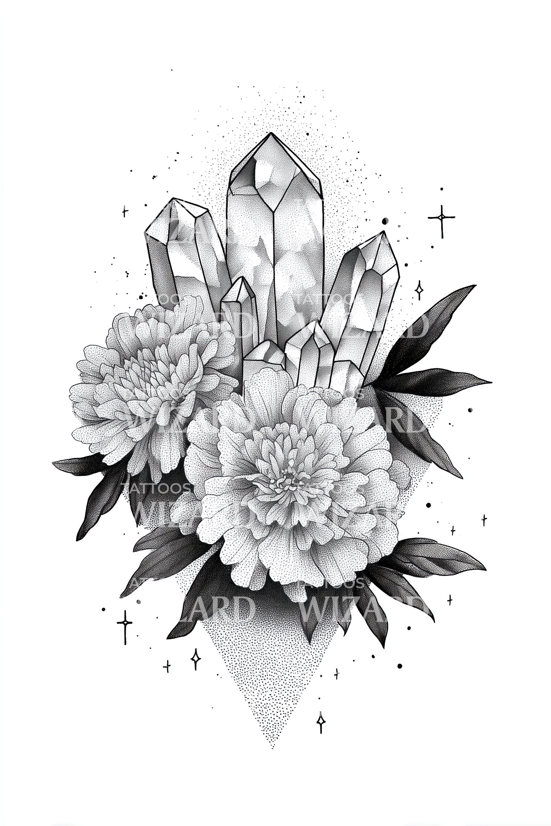 沉浸于大自然的美丽,这款花卉纹身设计巧妙地将几何图形与精致的花朵结合。中心的牡丹花由闪耀的水晶和宝石点缀。以这充满活力且富有艺术感的盛开牡丹象征,体现成长与坚韧的本质。